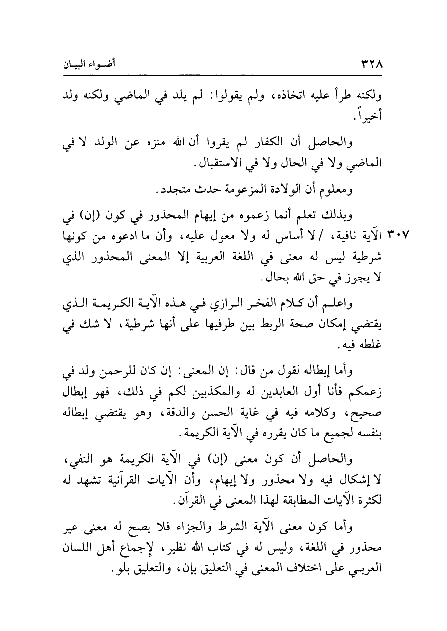 وبذلك تعلم أنما زعموه من إيهام المحذور في كون (إن) في الآية نافية، لا أساس له ولا معول عليه، وأن ما ادعوه من كونها شرطية ليس له معنى في اللغة العربية إلا المعنى المحذور الذي لا يجوز في حق الله بحال.