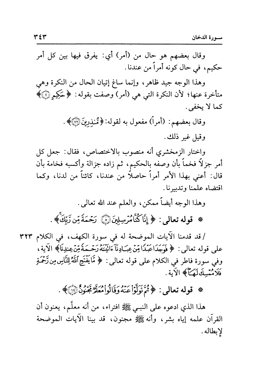 وقال بعضهم هو حال من (أمر) أي: يفرق فيها بين كل أمر حكيم، في حال كونه أمرًا من عندنا.