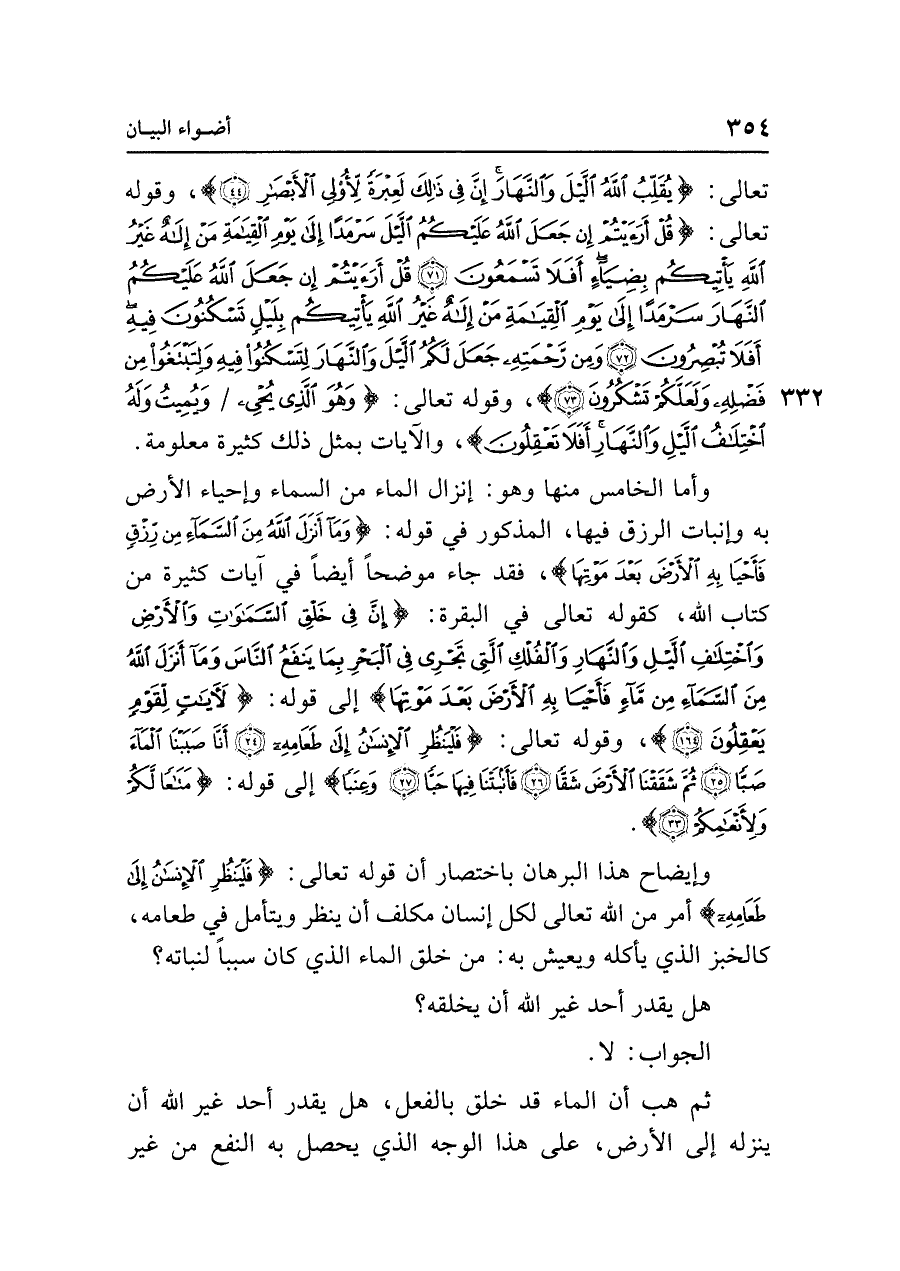 تعالى: {يُقَلِّبُ اللَّهُ اللَّيلَ وَالنَّهَارَ إِنَّ فِي ذَلِكَ لَعِبْرَةً لِأُولِي الْأَبْصَارِ (٤٤)}، وقوله تعالى: {قُلْ أَرَأَيتُمْ إِنْ جَعَلَ اللَّهُ عَلَيكُمُ اللَّيلَ سَرْمَدًا إِلَى يَوْمِ الْقِيَامَةِ مَنْ إِلَهٌ غَيرُ اللَّهِ يَأْتِيكُمْ بِضِيَاءٍ أَفَلَا تَسْمَعُونَ (٧١) قُلْ أَرَأَيتُمْ إِنْ جَعَلَ اللَّهُ عَلَيكُمُ النَّهَارَ سَرْمَدًا إِلَى يَوْمِ الْقِيَامَةِ مَنْ إِلَهٌ غَيرُ اللَّهِ يَأْتِيكُمْ بِلَيلٍ تَسْكُنُونَ فِيهِ أَفَلَا تُبْصِرُونَ (٧٢) وَمِنْ رَحْمَتِهِ جَعَلَ لَكُمُ اللَّيلَ وَالنَّهَارَ لِتَسْكُنُوا فِيهِ وَلِتَبْتَغُوا مِنْ فَضْلِهِ وَلَعَلَّكُمْ تَشْكُرُونَ (٧٣)}، وقوله تعالى: {وَهُوَ الَّذِي يُحْيِي وَيُمِيتُ وَلَهُ اخْتِلَافُ اللَّيلِ وَالنَّهَارِ أَفَلَا تَعْقِلُونَ}، والآيات بمثل ذلك كثيرة معلومة.