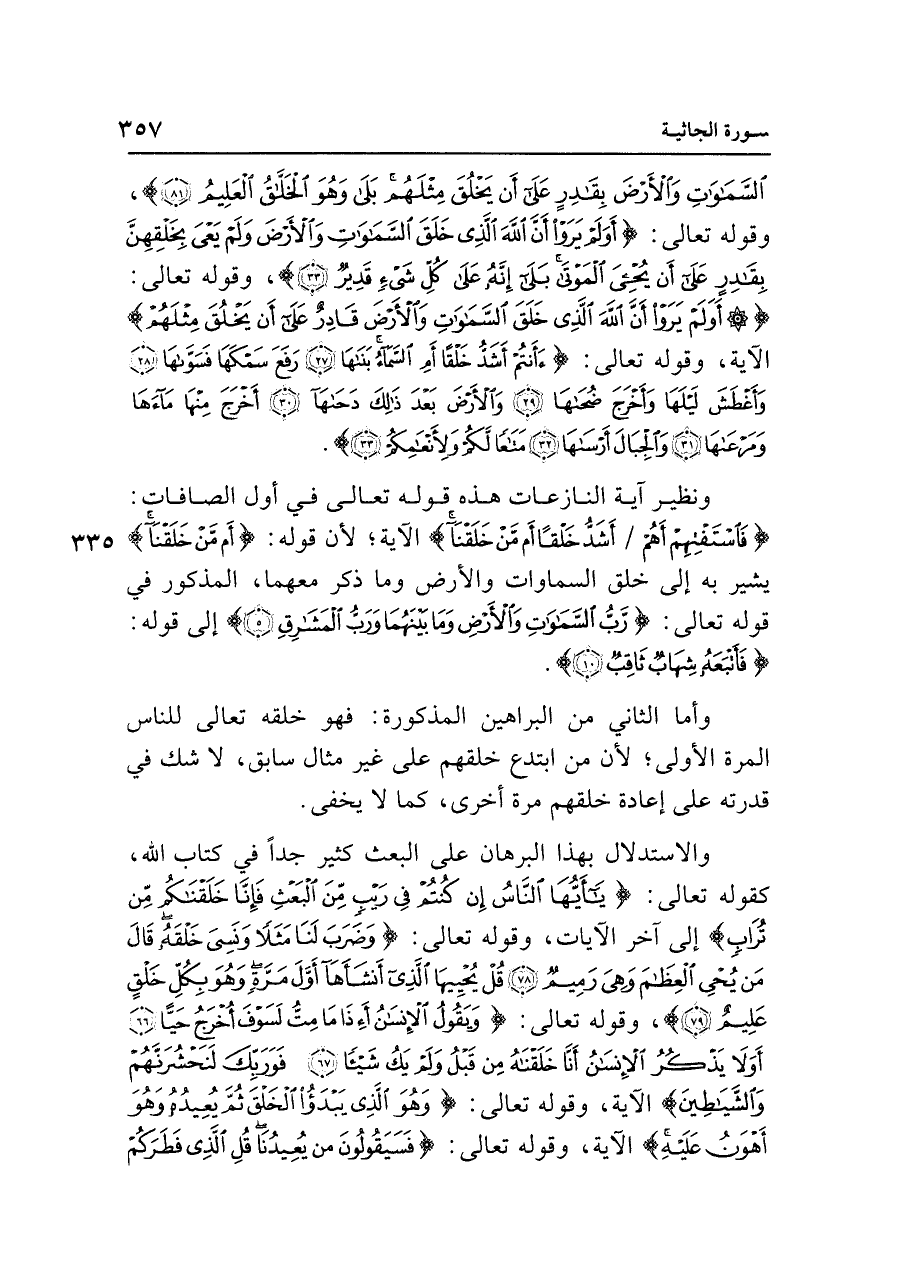 السَّمَاوَاتِ وَالْأَرْضَ بِقَادِرٍ عَلَى أَنْ يَخْلُقَ مِثْلَهُمْ بَلَى وَهُوَ الْخَلَّاقُ الْعَلِيمُ (٨١)}، وقوله تعالى: {أَوَلَمْ يَرَوْا أَنَّ اللَّهَ الَّذِي خَلَقَ السَّمَاوَاتِ وَالْأَرْضَ وَلَمْ يَعْيَ بِخَلْقِهِنَّ بِقَادِرٍ عَلَى أَنْ يُحْيِيَ الْمَوْتَى بَلَى إِنَّهُ عَلَى كُلِّ شَيءٍ قَدِيرٌ (٣٣)} وقوله تعالى: {أَوَلَمْ يَرَوْا أَنَّ اللَّهَ الَّذِي خَلَقَ السَّمَاوَاتِ وَالْأَرْضَ قَادِرٌ عَلَى أَنْ يَخْلُقَ مِثْلَهُمْ} الآية، وقوله تعالى: {أَأَنْتُمْ أَشَدُّ خَلْقًا أَمِ السَّمَاءُ بَنَاهَا (٢٧) رَفَعَ سَمْكَهَا فَسَوَّاهَا (٢٨) وَأَغْطَشَ لَيلَهَا وَأَخْرَجَ ضُحَاهَا (٢٩) وَالْأَرْضَ بَعْدَ ذَلِكَ دَحَاهَا (٣٠) أَخْرَجَ مِنْهَا مَاءَهَا وَمَرْعَاهَا (٣١) وَالْجِبَال أَرْسَاهَا (٣٢) مَتَاعًا لَكُمْ وَلِأَنْعَامِكُمْ (٣٣)}.