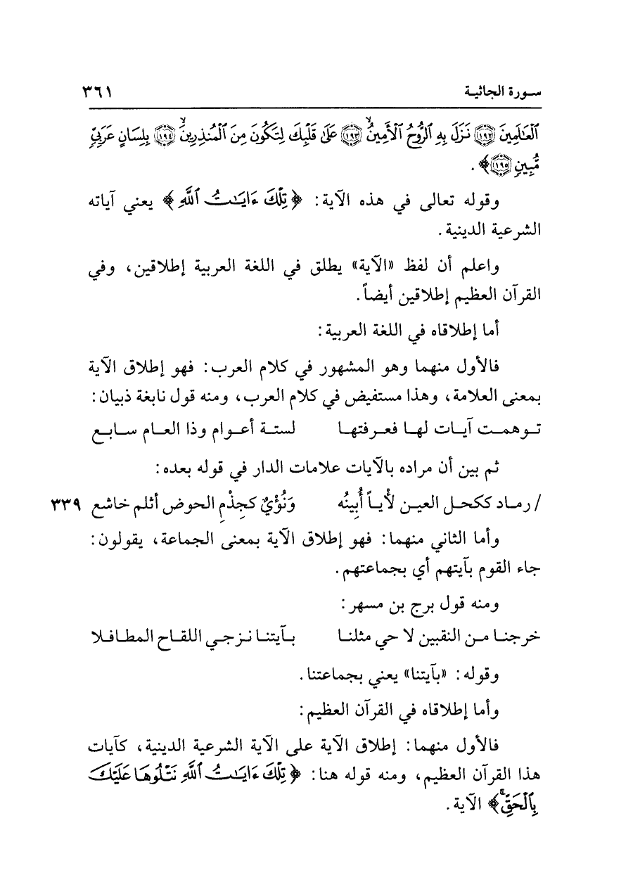 واعلم أن لفظ "الآية" يطلق في اللغة العربية إطلاقين، وفي القرآن العظيم إطلاقين أيضًا.