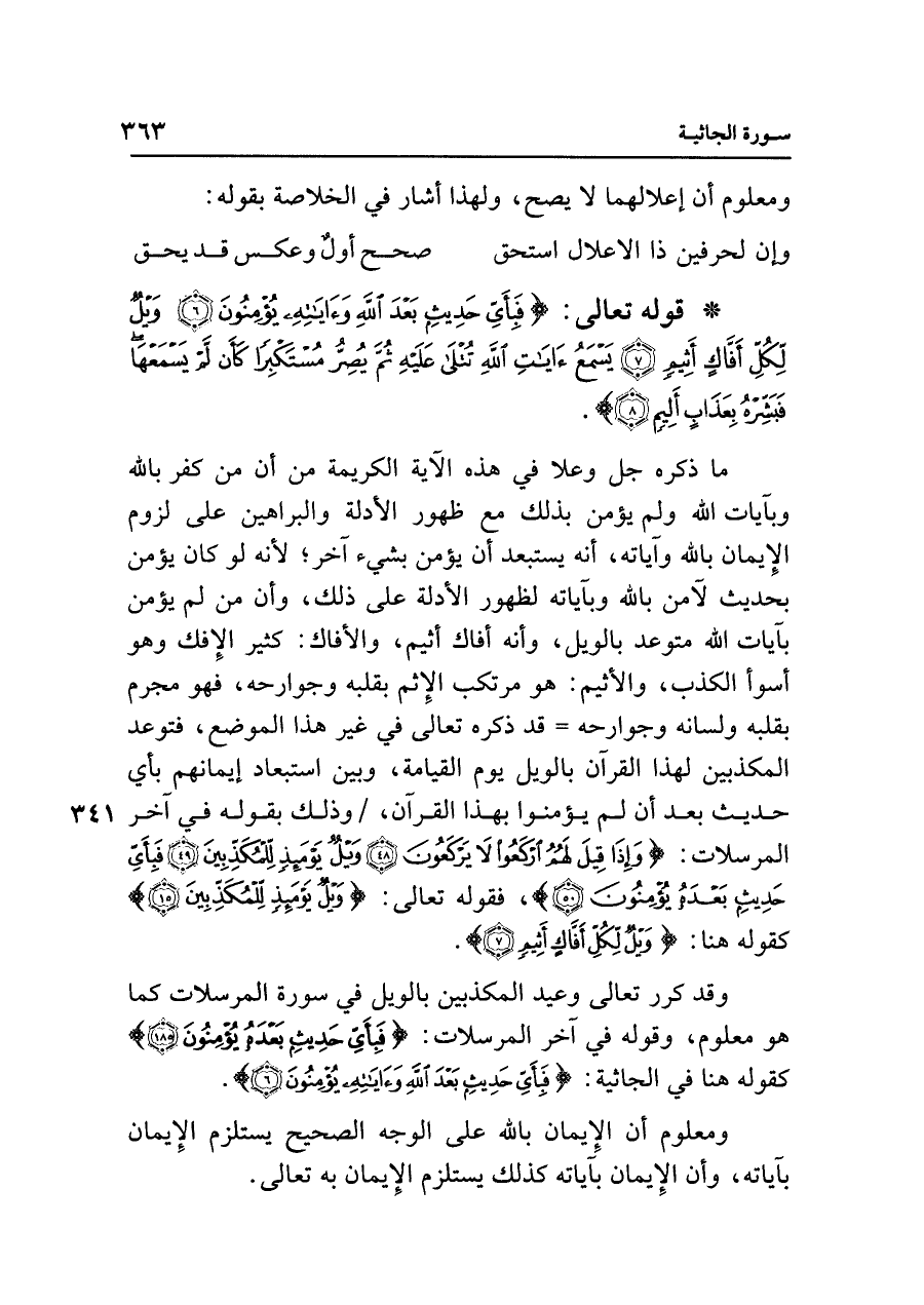 • قول تعالى: {فَبِأَيِّ حَدِيثٍ بَعْدَ اللَّهِ وَآيَاتِهِ يُؤْمِنُونَ (٦) وَيلٌ لِكُلِّ أَفَّاكٍ أَثِيمٍ (٧) يَسْمَعُ آيَاتِ اللَّهِ تُتْلَى عَلَيهِ ثُمَّ يُصِرُّ مُسْتَكْبِرًا كَأَنْ لَمْ يَسْمَعْهَا فَبَشِّرْهُ بِعَذَابٍ أَلِيمٍ (٨)}.
