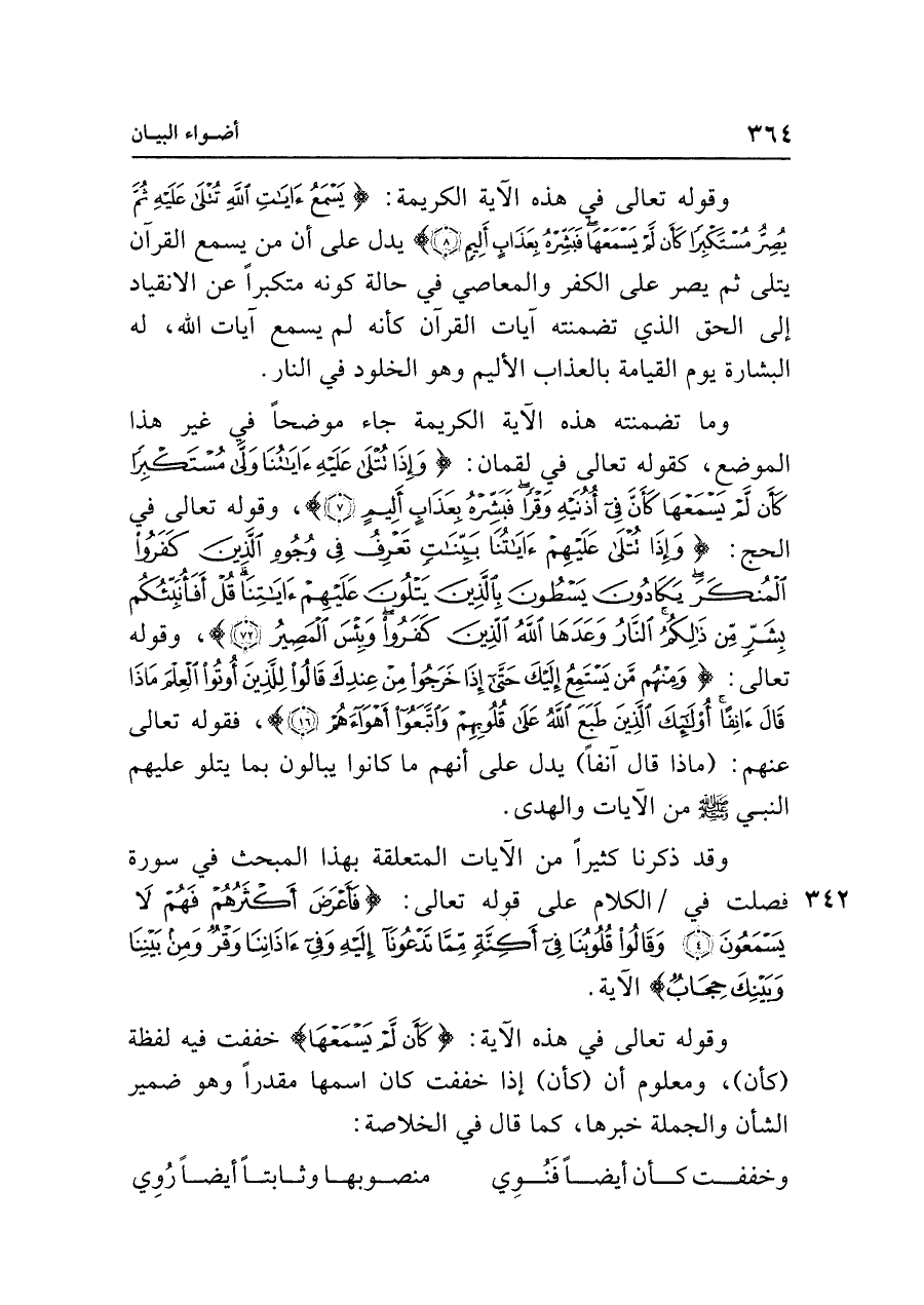 وقوله تعالى في هذه الآية: {كَأَنْ لَمْ يَسْمَعْهَا} خففت فيه لفظة (كأن)، ومعلوم أن (كأن) إذا خففت كان اسمها مقدرًا وهو ضمير الشأن والجملة خبرها، كما قال في الخلاصة: