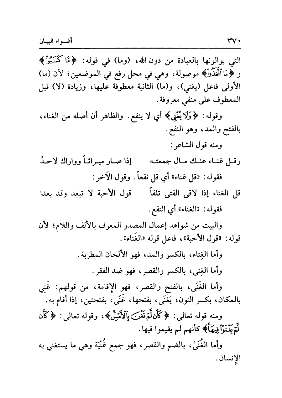 وقوله: {وَلَا يُغْنِي} أي لا ينفع. والظاهر أن أصله من الغناء، بالفتح والمد، وهو النفع.