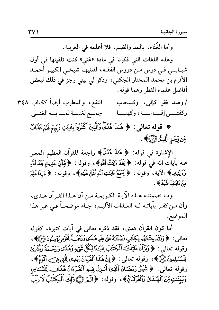 • قوله تعالى: {هَذَا هُدًى وَالَّذِينَ كَفَرُوا بِآيَاتِ رَبِّهِمْ لَهُمْ عَذَابٌ مِنْ رِجْزٍ أَلِيمٌ (١١)}.