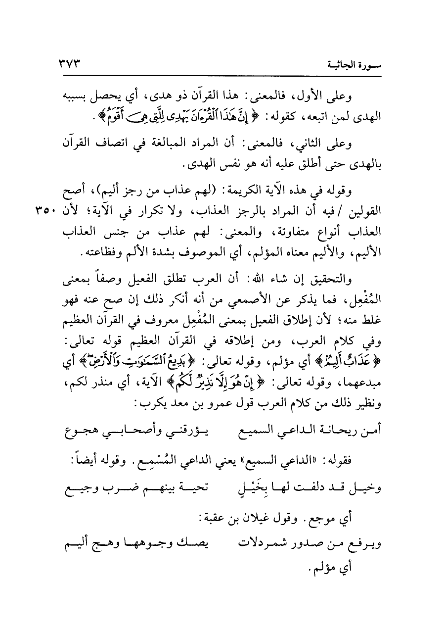 والتحقيق إن شاء الله: أن العرب تطلق الفعيل وصفًا بمعنى المُفْعِل، فما يذكر عن الأصمعي من أنَّه أنكر ذلك إن صح عنه فهو غلط منه، لأن إطلاق الفعيل بمعنى المُفْعِل معروف في القرآن العظيم وفي كلام العرب، ومن إطلاقه في القرآن العظيم قوله تعالى: {عَذَابٌ أَلِيمٌ} أي مؤلم، وقوله تعالى: {بَدِيعُ السَّمَاوَاتِ وَالْأَرْضِ} أي مبدعهما، وقوله تعالى: {إِنْ هُوَ إلا نَذِيرٌ لَكُمْ} الآية، أي منذر لكم، ونظير ذلك من كلام العرب قول عمرو بن معد يكرب: