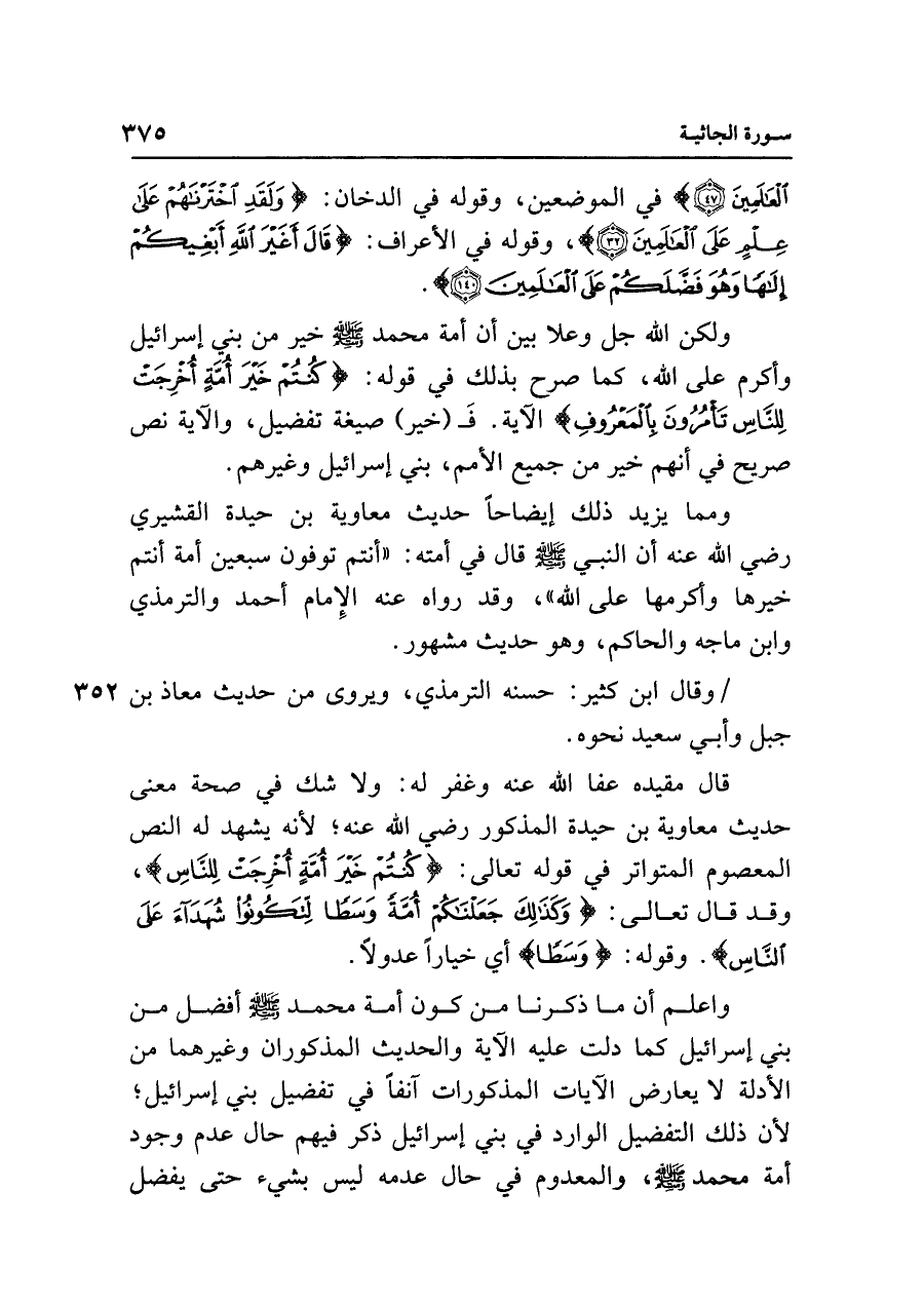 ومما يزيد ذلك إيضاحًا حديث معاوية بن حيدة القشيري رضي الله عنه أن النبي - صلى الله عليه وسلم - قال في أمته: "أنتم توفون سبعين أمة أنتم خيرها وأكرمها على الله"، وقد رواه عنه الإِمام أحمد والتِّرمِذي وابن ماجة والحاكم، وهو حديث مشهور.