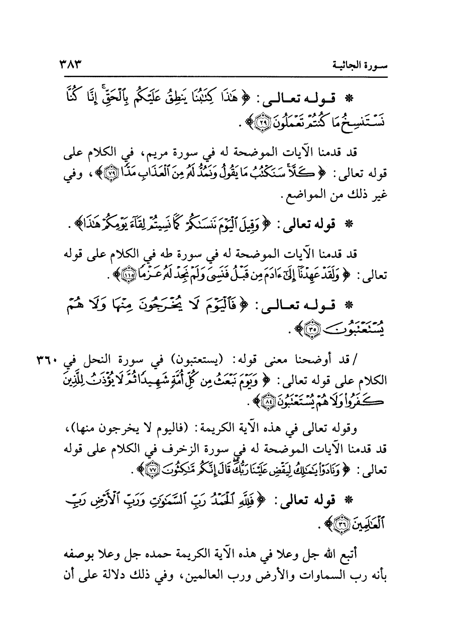• قوله تعالى: {فَلِلَّهِ الْحَمْدُ رَبِّ السَّمَاوَاتِ وَرَبِّ الْأَرْضِ رَبِّ الْعَالمِينَ (٣٦)}.