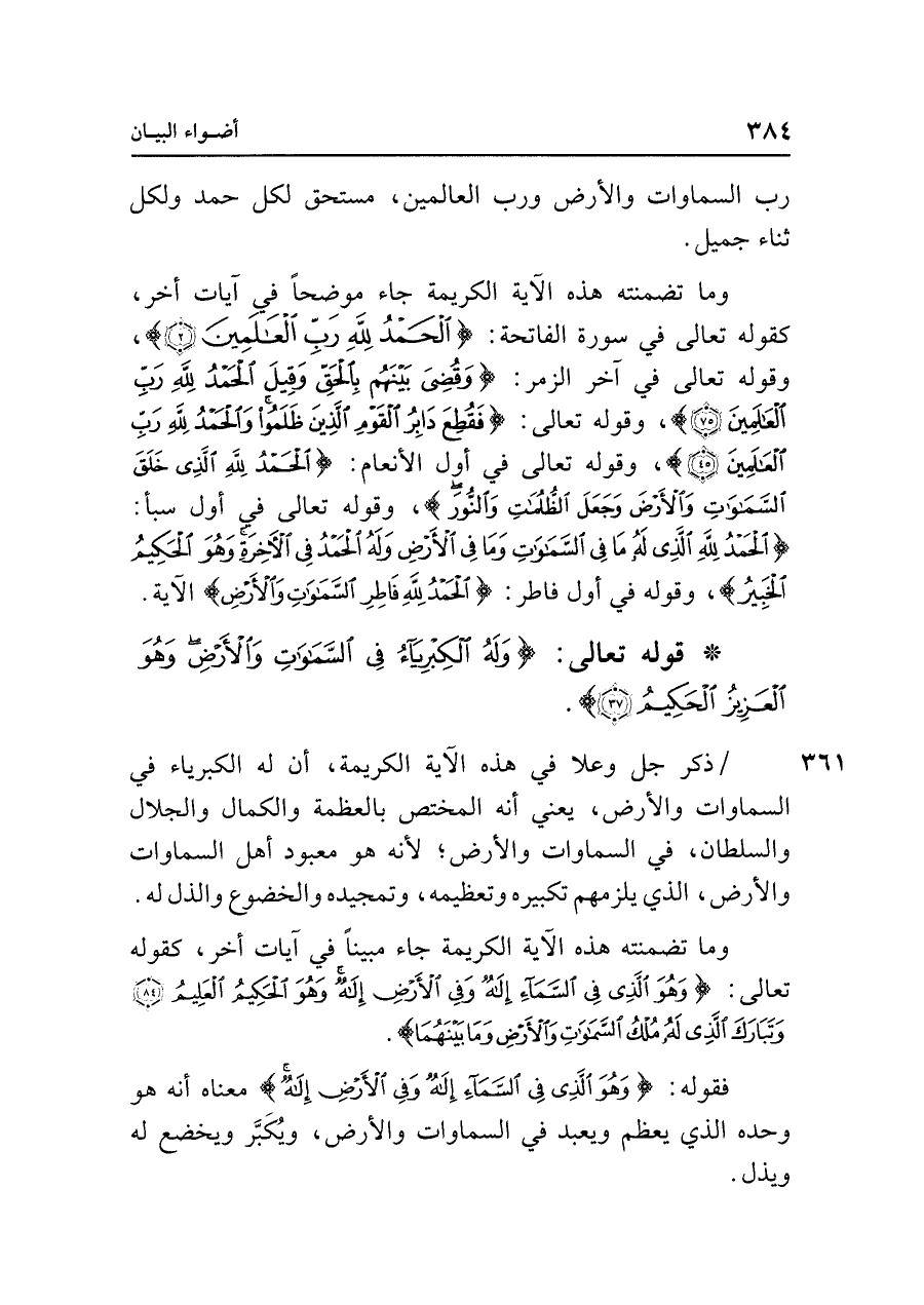 • قوله تعالى: {وَلَهُ الْكِبْرِيَاءُ فِي السَّمَاوَاتِ وَالْأَرْضِ وَهُوَ الْعَزِيزُ الْحَكِيمُ (٣٧)}.