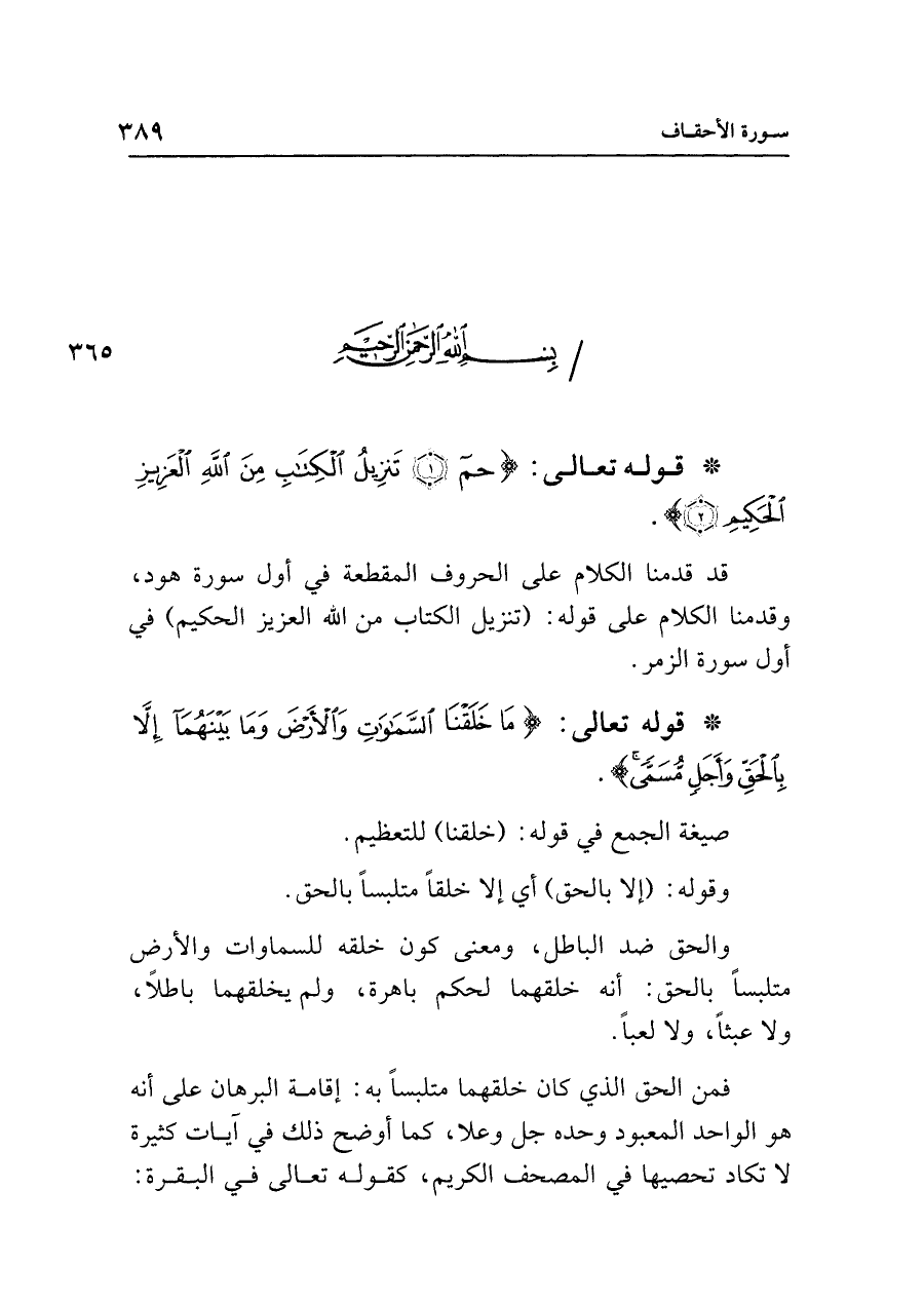 • قوله تعالى: {مَا خَلَقْنَا السَّمَاوَاتِ وَالْأَرْضَ وَمَا بَينَهُمَا إلا بِالْحَقِّ وَأَجَلٍ مُسَمًّى}.