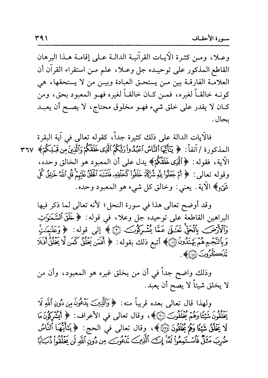 وعلا، ومن كثرة الآيات القرآنية الدالة على إقامة هذا البرهان القاطع المذكور على توحيده جل وعلا، علم من استقراء القرآن أن العلامة الفارقة بين من يستحق العبادة وبين من لا يستحقها، هي كونه خالقًا لغيره، فمن كان خالقًا لغيره فهو المعبود بحق، ومن كان لا يقدر على خلق شيء فهو مخلوق محتاج، لا يصح أن يعبد بحال.