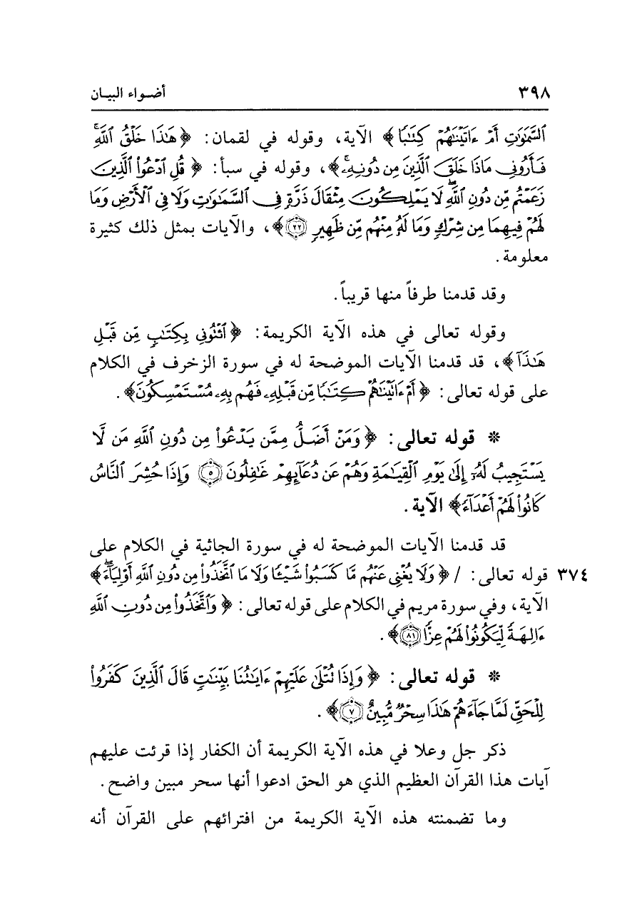 السَّمَاوَاتِ ائْتُونِي بِكِتَابٍ} الآية، وقوله في لقمان: {هَذَا خَلْقُ اللَّهِ فَأَرُونِي مَاذَا خَلَقَ الَّذِينَ مِنْ دُونِهِ}، وقوله في سبأ: {قُلِ ادْعُوا الَّذِينَ زَعَمْتُمْ مِنْ دُونِ اللَّهِ لَا يَمْلِكُونَ مِثْقَال ذَرَّةٍ فِي السَّمَاوَاتِ وَلَا فِي الْأَرْضِ وَمَا لَهُمْ فِيهِمَا مِنْ شِرْكٍ وَمَا لَهُ مِنْهُمْ مِنْ ظَهِيرٍ (٢٢)}، والآيات بمثل ذلك كثيرة معلومة.