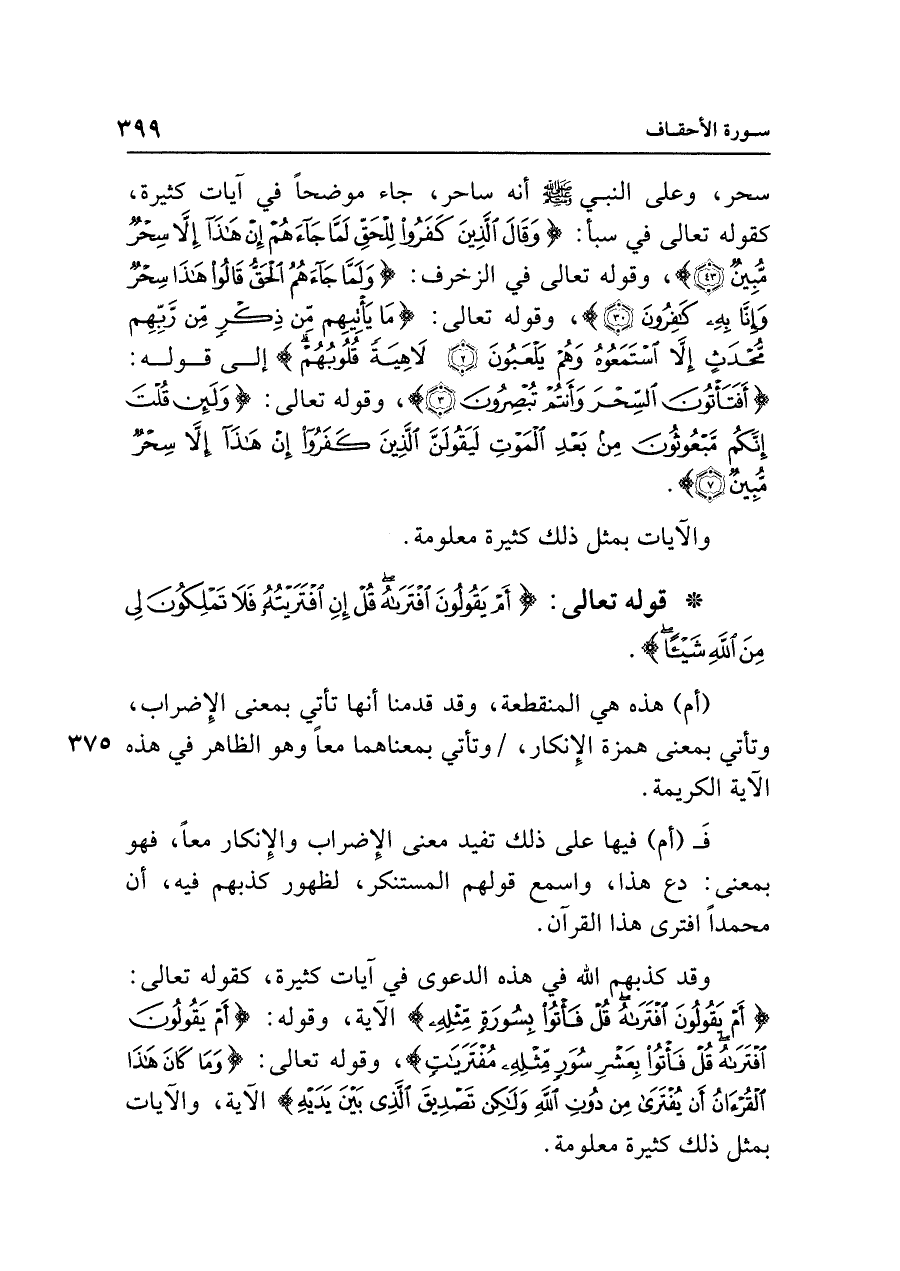سحر، وعلى النبي - صلى الله عليه وسلم - أنَّه ساحر، جاء موضحًا في آيات كثيرة، كقوله تعالى في سبأ: {وَقَالُوا مَا هَذَا إلا إِفْكٌ مُفْتَرًى وَقَال الَّذِينَ كَفَرُوا لِلْحَقِّ لَمَّا جَاءَهُمْ إِنْ هَذَا إلا سِحْرٌ مُبِينٌ (٤٣)}، وقوله تعالى في الزخرف: {وَلَمَّا جَاءَهُمُ الْحَقُّ قَالُوا هَذَا سِحْرٌ وَإِنَّا بِهِ كَافِرُونَ (٣٠)}، وقوله تعالى: {مَا يَأْتِيهِمْ مِنْ ذِكْرٍ مِنْ رَبِّهِمْ مُحْدَثٍ إلا اسْتَمَعُوهُ وَهُمْ يَلْعَبُونَ (٢) لَاهِيَةً قُلُوبُهُمْ} إلى قوله: {أَفَتَأْتُونَ السِّحْرَ وَأَنْتُمْ تُبْصِرُونَ (٣)}، وقوله تعالى: {وَلَئِنْ قُلْتَ إِنَّكُمْ مَبْعُوثُونَ مِنْ بَعْدِ الْمَوْتِ لَيَقُولَنَّ الَّذِينَ كَفَرُوا إِنْ هَذَا إلا سِحْرٌ مُبِينٌ (٧)}.