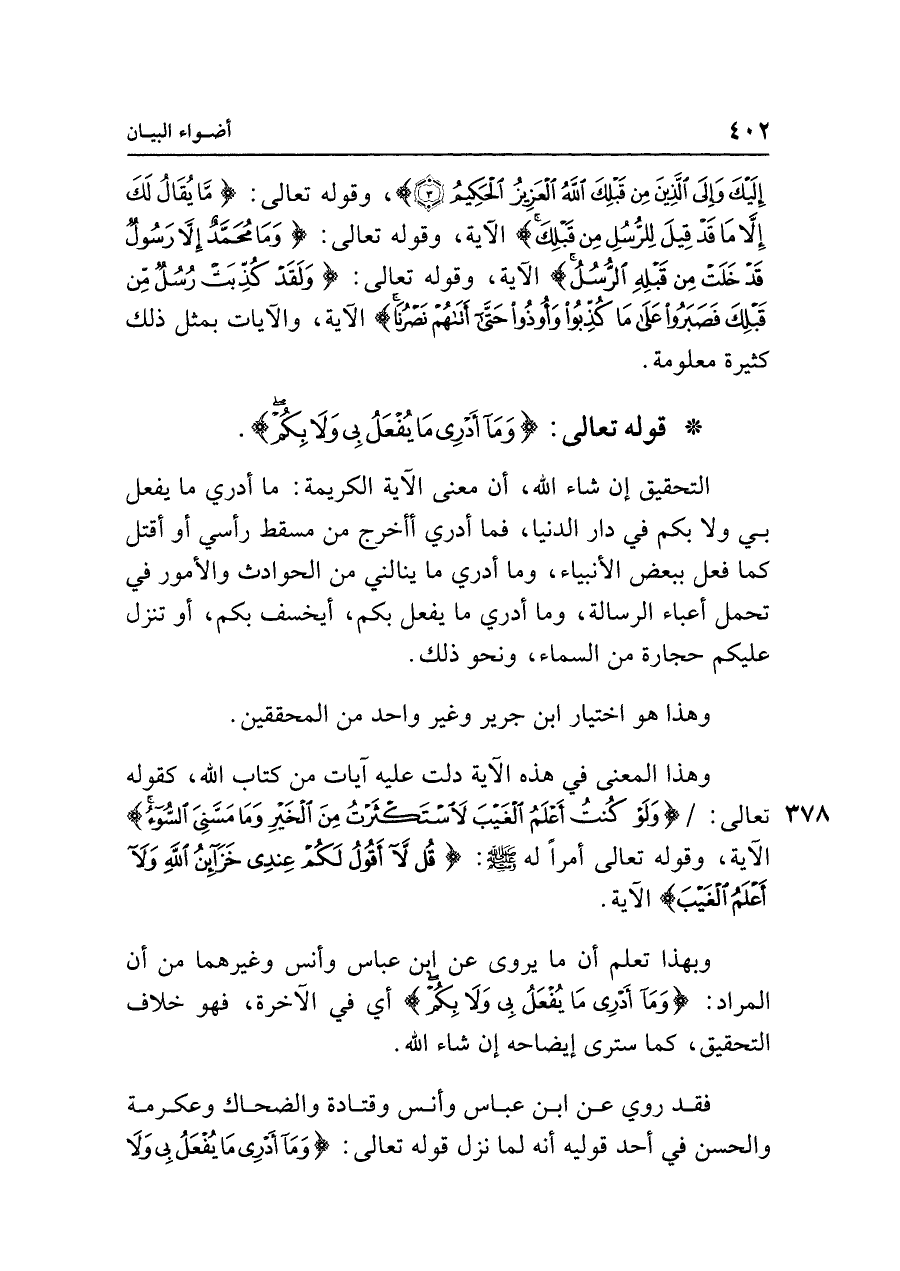 وبهذا تعلم أن ما يروى عن ابن عبَّاس وأنس وغيرهما من أن المراد: {مَا يُفْعَلُ بِي وَلَا بِكُمْ} أي في الآخرة، فهو خلاف التحقيق، كما سترى إيضاحه إن شاء الله.