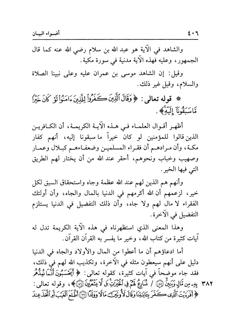 • قوله تعالى: {وَقَال الَّذِينَ كَفَرُوا لِلَّذِينَ آمَنُوا لَوْ كَانَ خَيرًا مَا سَبَقُونَا إِلَيهِ}.