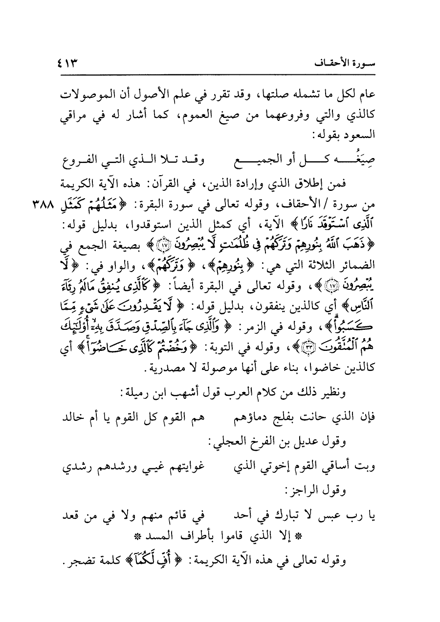 فمن إطلاق الذي وإرادة الذين، في القرآن: هذه الآية الكريمة من سورة الأحقاف، وقوله تعالى في سورة البقرة: {مَثَلُهُمْ كَمَثَلِ الَّذِي اسْتَوْقَدَ نَارًا} الآية، أي كمثل الذين استوقدوا، بدليل قوله: {ذَهَبَ اللَّهُ بِنُورِهِمْ وَتَرَكَهُمْ فِي ظُلُمَاتٍ لَا يُبْصِرُونَ (١٧)} بصيغة الجمع في الضمائر الثلاثة التي هي: {بِنُورِهِمْ}، {وَتَرَكَهُمْ}، والواو في: {لَا يُبْصِرُونَ}، وقوله تعالى في البقرة أيضًا: {كَالَّذِي يُنْفِقُ مَالهُ رِئَاءَ النَّاسِ} أي كالذين ينفقون، بدليل قوله: {لَا يَقْدِرُونَ عَلَى شَيءٍ مِمَّا كَسَبُوا}، وقوله في الزمر: {وَالَّذِي جَاءَ بِالصِّدْقِ وَصَدَّقَ بِهِ أُولَئِكَ هُمُ الْمُتَّقُونَ (٣٣)} وقوله في التوبة: {وَخُضْتُمْ كَالَّذِي خَاضُوا} أي كالذين خاضوا، بناء على أنَّها موصولة لا مصدرية.
