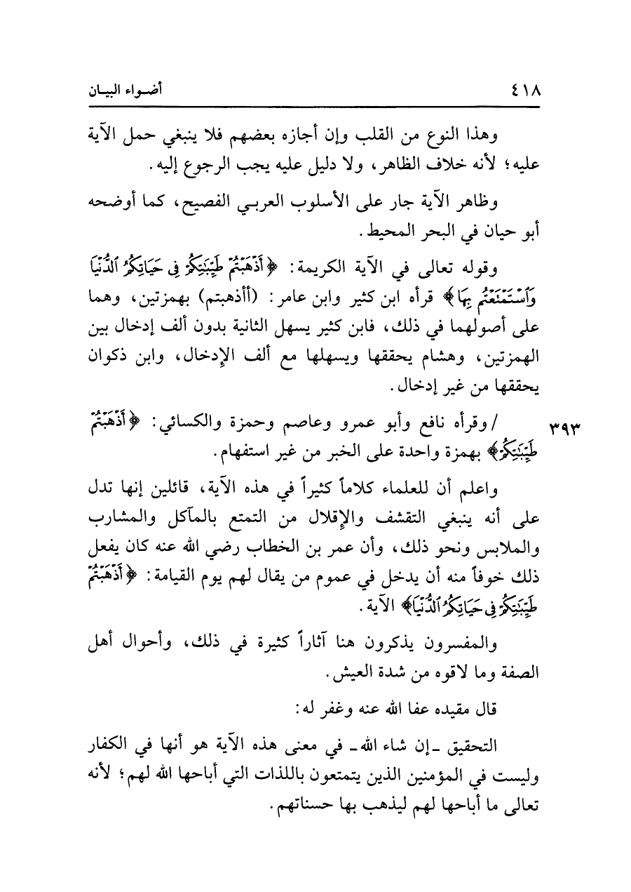 واعلم أن للعلماء كلامًا كثيرًا في هذه الآية، قائلين إنها تدل على أنَّه ينبغي التقشف والإِقلال من التمتع بالمآكل والمشارب والملابس ونحو ذلك، وأن عمر بن الخطاب رضي الله عنه كان يفعل ذلك خوفًا منه أن يدخل في عموم من يقال لهم يوم القيامة: {أَذْهَبْتُمْ طَيِّبَاتِكُمْ} طَيِّبَاتِكُمْ فِي حَيَاتِكُمُ الدُّنْيَا} الآية.
