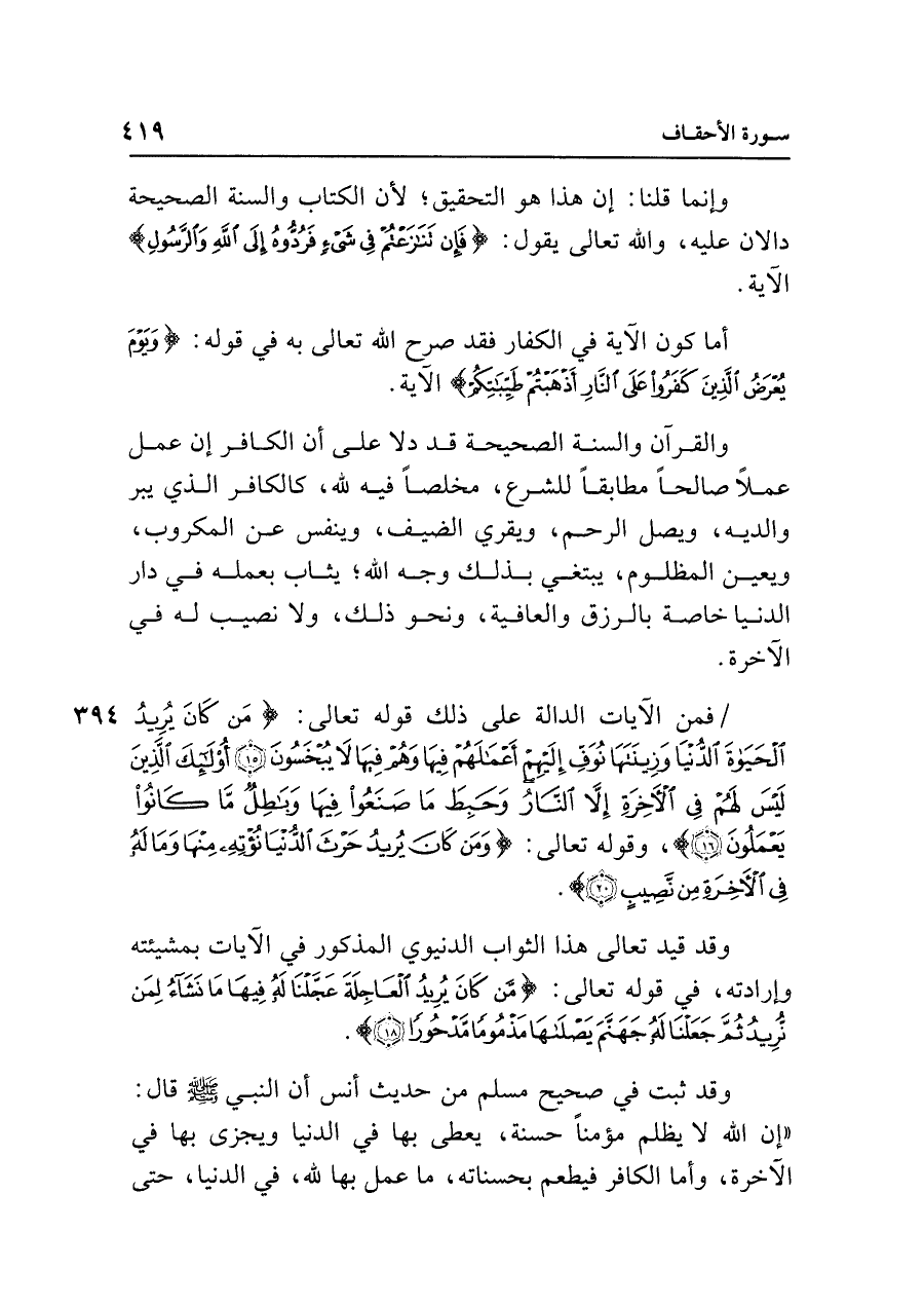 وقد ثبت في صحيح مسلم من حديث أَنس أن النبي - صلى الله عليه وسلم - قال: "إن الله لا يظلم مؤمنًا حسنة، يعطى بها في الدنيا ويجزى بها في الآخرة، وأما الكافر فيطعم بحسناته، ما عمل بها لله، في الدنيا، حتَّى