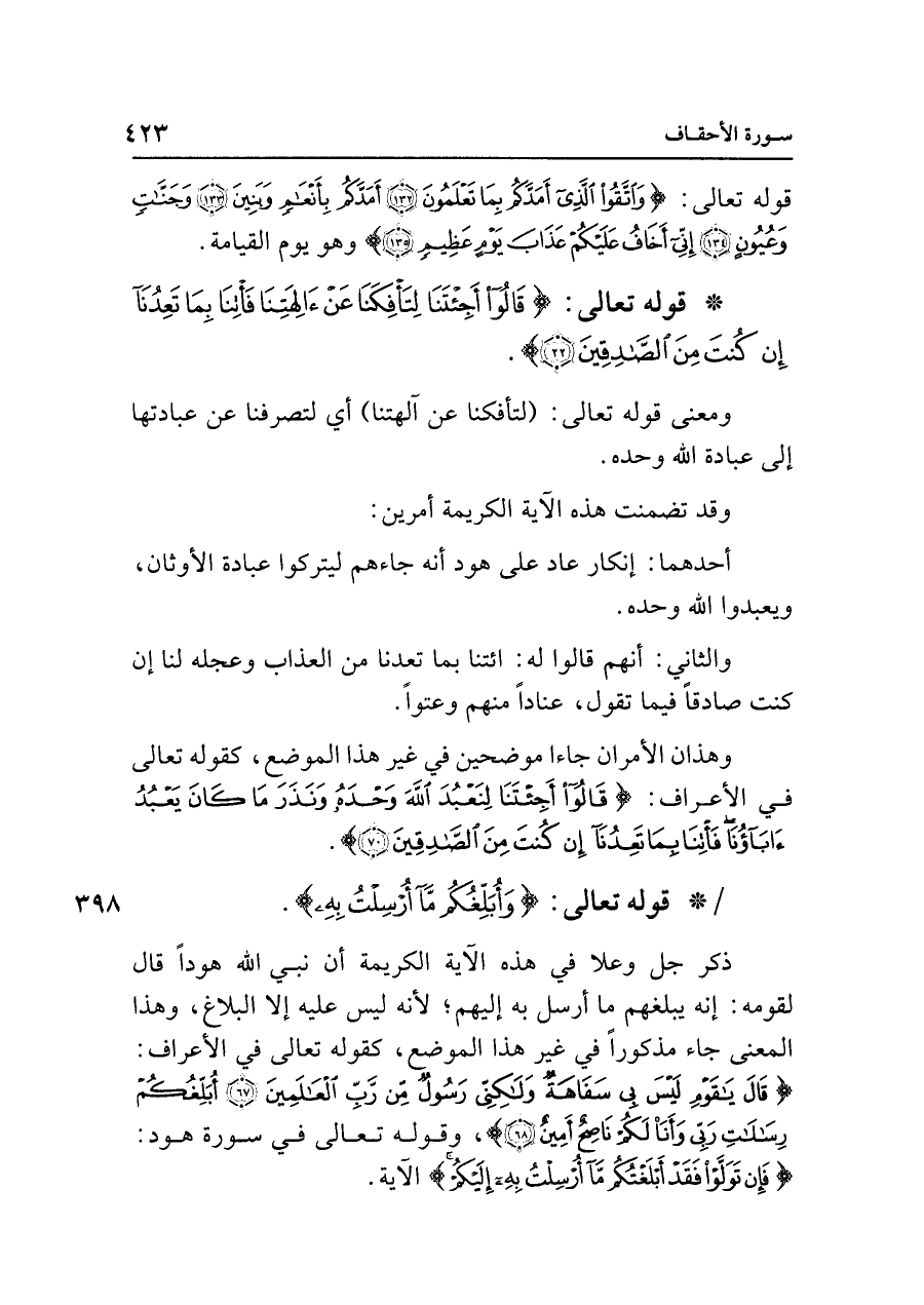 ذكر جل وعلا في هذه الآية الكريمة أن نبي الله هودًا قال لقومه: إنه يبلغهم ما أرسل به إليهم؛ لأنه ليس عليه إلا البلاغ، وهذا المعنى جاء مذكورًا في غير هذا الموضع، كقوله تعالى في الأعراف: {قَال يَاقَوْمِ لَيسَ بِي سَفَاهَةٌ وَلَكِنِّي رَسُولٌ مِنْ رَبِّ الْعَالمِينَ (٦٧) أُبَلِّغُكُمْ رِسَالاتِ رَبِّي وَأَنَا لَكُمْ نَاصِحٌ أَمِينٌ (٦٨)}، وقوله تعالى في سورة هود: {فَإِنْ تَوَلَّوْا فَقَدْ أَبْلَغْتُكُمْ مَا أُرْسِلْتُ بِهِ إِلَيكُمْ} الآية.