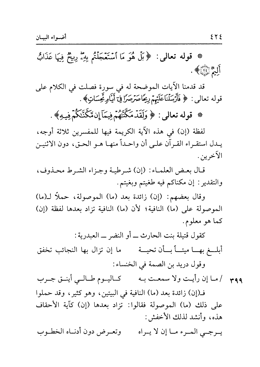فـ (إن) زائدة بعد (ما) النافية في البيتين، وهو كثير، وقد حملوا على ذلك (ما) الموصولة فقالوا: تزاد بعدها (إن) كآية الأحقاف هذه، وأنشد لذلك الأخفش: