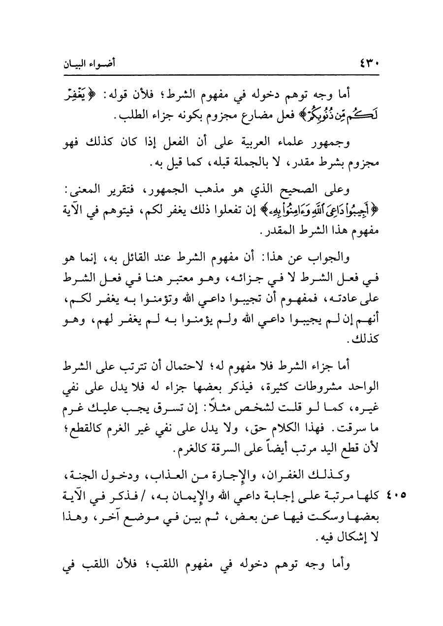 والجواب عن هذا: أن مفهوم الشرط عند القائل به، إنما هو في فعل الشرط لا في جزائه، وهو معتبر هنا في فعل الشرط على عادته، فمفهوم أن تجيبوا داعي الله وتؤمنوا به يغفر لكم، أنهم إن لم يجيبوا داعي الله ولم يؤمنوا به لم يغفر لهم، وهو كذلك.