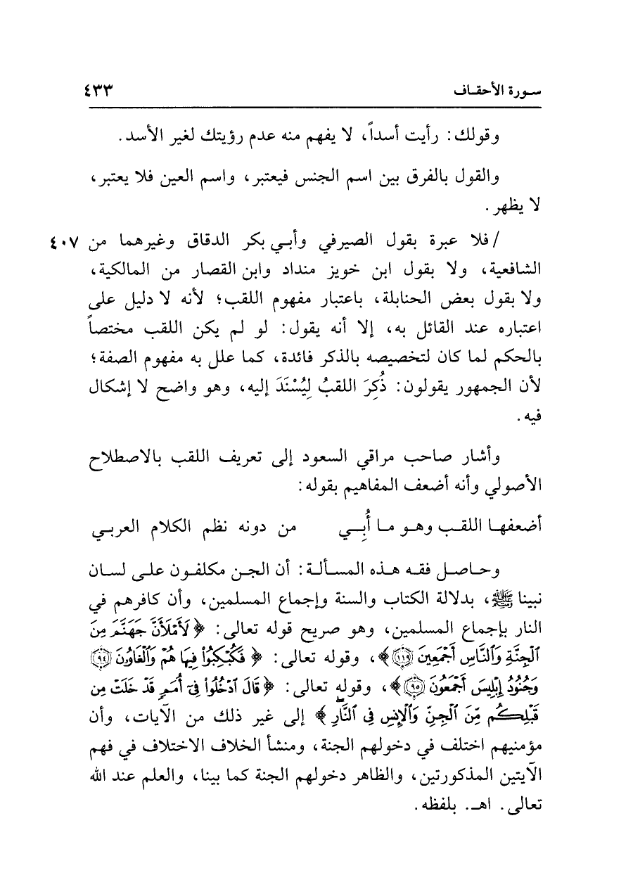 وحاصل فقه هذه المسألة: أن الجن مكلفون على لسان نبينا - صلى الله عليه وسلم - ، بدلالة الكتاب والسنة وإجماع المسلمين، وأن كافرهم في النار بإجماع المسلمين، وهو صريح قوله تعالى: {لأَمْلأَنَّ جَهَنَّمَ مِنَ الْجِنَّةِ وَالنَّاسِ أَجْمَعِينَ (١١٩)}، وقوله تعالى: {فَكُبْكِبُوا فِيهَا هُمْ وَالْغَاوُونَ (٩٤) وَجُنُودُ إِبْلِيسَ أَجْمَعُونَ (٩٥)}، وقوله تعالى: {قَال ادْخُلُوا فِي أُمَمٍ قَدْ خَلَتْ مِنْ قَبْلِكُمْ مِنَ الْجِنِّ وَالْإِنْسِ فِي النَّارِ} إلى غير ذلك من الآيات، وأن مؤمنيهم اختلف في دخولهم الجنة، ومنشأ الخلاف الاختلاف في فهم الآيتين المذكورتين، والظاهر دخولهم الجنة كما بينا، والعلم عند الله تعالى. اهـ. بلفظه.