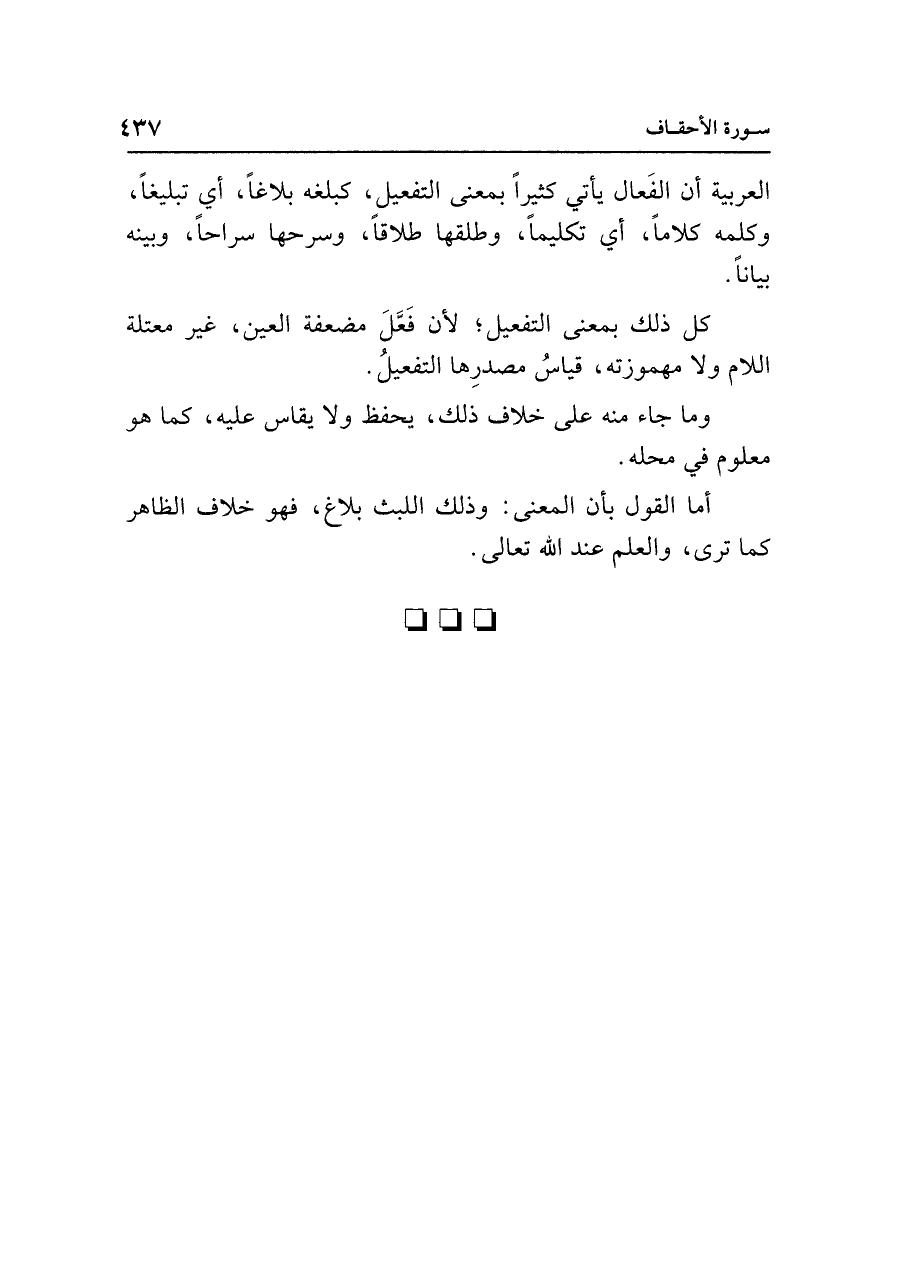 العربية أن الفَعال يأتي كثيرًا بمعنى التفعيل، كبلغه بلاغًا، أي تبليغًا، وكلمه كلامًا، أي تكليمًا، وطلقها طلاقًا، وسرحها سراحًا، وبينه بيانًا.