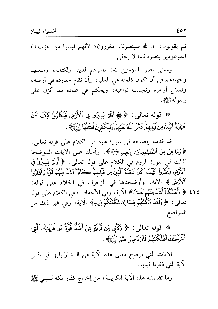 • قوله تعالى: {أَفَلَمْ يَسِيرُوا فِي الْأَرْضِ فَيَنْظُرُوا كَيفَ كَانَ عَاقِبَةُ الَّذِينَ مِنْ قَبْلِهِمْ دَمَّرَ اللَّهُ عَلَيهِمْ وَلِلْكَافِرِينَ أَمْثَالُهَا (١٠)}.