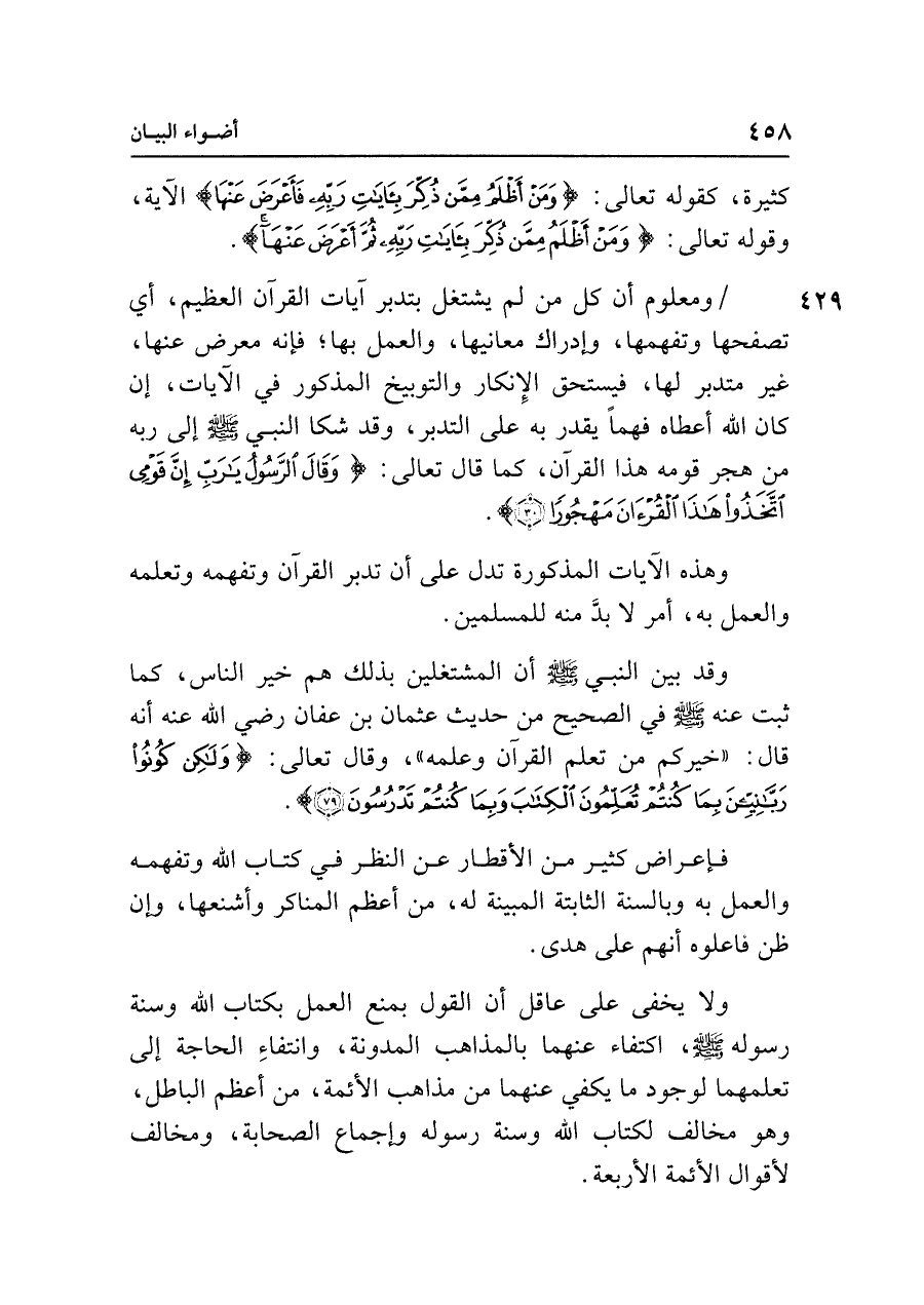 ومعلوم أن كل من لم يشتغل بتدبر آيات القرآن العظيم، أي تصفحها وتفهمها، وإدراك معانيها، والعمل بها؛ فإنه معرض عنها، غير متدبر لها، فيستحق الإِنكار والتوبيخ المذكور في الآيات، إن كان الله أعطاه فهمًا يقدر به على التدبر، وقد شكا النبي - صلى الله عليه وسلم - إلى ربه من هجر قومه هذا القرآن، كما قال تعالى: {وَقَال الرَّسُولُ يَا رَبِّ إِنَّ قَوْمِي اتَّخَذُوا هَذَا الْقُرْآنَ مَهْجُورًا (٣٠)}.