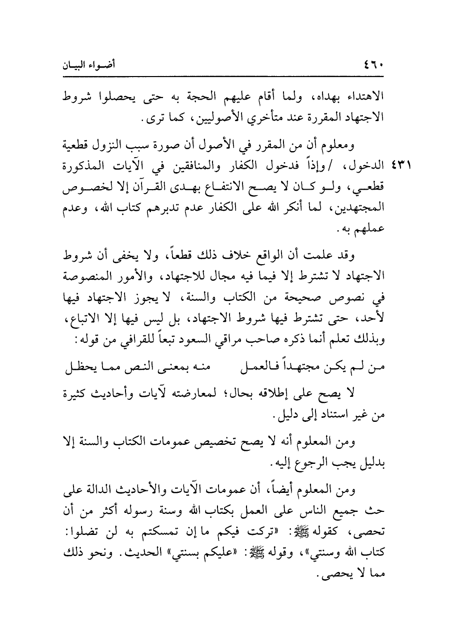 وقد علمت أن الواقع خلاف ذلك قطعًا، ولا يخفى أن شروط الاجتهاد لا تشترط إلا فيما فيه مجال للاجتهاد، والأمور المنصوصة في نصوص صحيحة من الكتاب والسنة، لا يجوز الاجتهاد فيها لأحد، حتى تشترط فيها شروط الاجتهاد، بل ليس فيها إلا الاتباع، وبذلك تعلم أنما ذكره صاحب مراقي السعود تبعًا للقرافي من قوله: