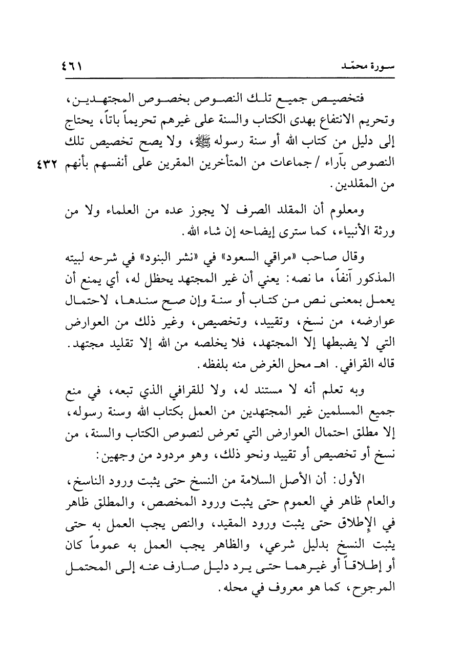وقال صاحب "مراقي السعود" في "نشر البنود" في شرحه لبيته المذكور آنفًا، ما نصه: يعني أن غير المجتهد يحظل له، أي يمنع أن يعمل بمعنى نص من كتاب أو سنة وإن صح سندها، لاحتمال عوارضه، من نسخ، وتقييد، وتخصيص، وغير ذلك من العوارض التي لا يضبطها إلا المجتهد، فلا يخلصه من الله إلا تقليد مجتهد. قاله القرافي. اهـ محل الغرض منه بلفظه.
