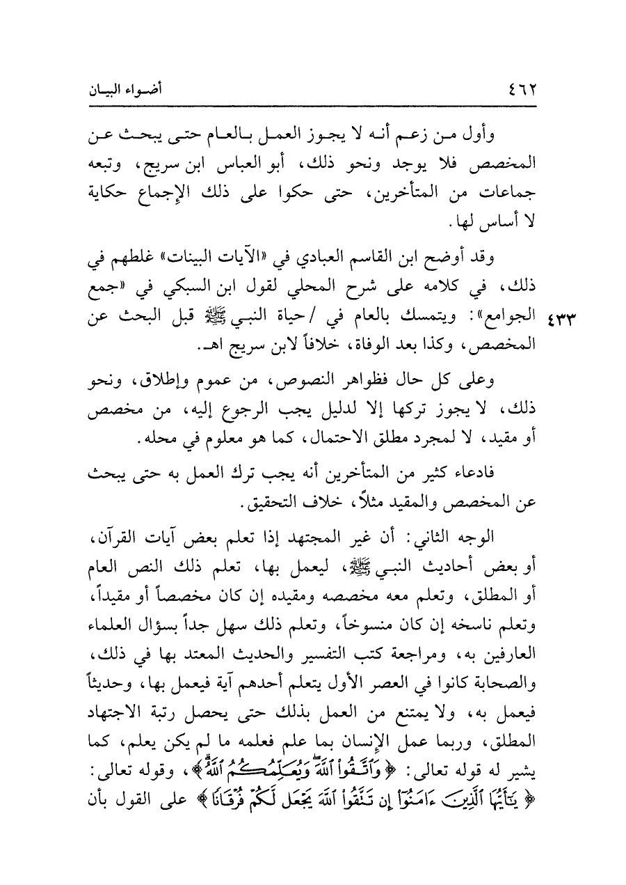 الوجه الثاني: أن غير المجتهد إذا تعلم بعض آيات القرآن، أو بعض أحاديث النبي - صلى الله عليه وسلم - ، ليعمل بها، تعلم ذلك النص العام أو المطلق، وتعلم معه مخصصه ومقيده إن كان مخصصًا أو مقيدًا، وتعلم ناسخه إن كان منسوخًا، وتعلم ذلك سهل جدًّا بسؤال العلماء العارفين به، ومراجعة كتب التفسير والحديث المعتد بها في ذلك، والصحابة كانوا في العصر الأول يتعلم أحدهم آية فيعمل بها، وحديثًا فيعمل به، ولا يمتنع من العمل بذلك حتى يحصل رتبة الاجتهاد المطلق، وربما عمل الإِنسان بما علم فعلمه ما لم يكن يعلم، كما يشير له قوله تعالى: {وَاتَّقُوا اللَّهَ وَيُعَلِّمُكُمُ اللَّهُ}، وقوله تعالى: {يَا أَيُّهَا الَّذِينَ آمَنُوا إِنْ تَتَّقُوا اللَّهَ يَجْعَلْ لَكُمْ فُرْقَانًا} على القول بأن
