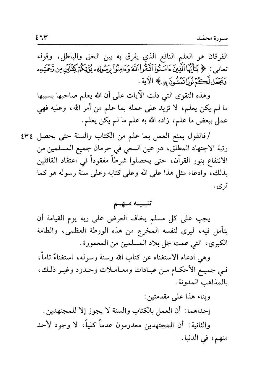 فالقول بمنع العمل بما علم من الكتاب والسنة حتى يحصل رتبة الاجتهاد المطلق، هو عين السعي في حرمان جميع المسلمين من الانتفاع بنور القرآن، حتى يحصلوا شرطًا مفقودًا في اعتقاد القائلين بذلك، وادعاء مثل هذا على الله وعلى كتابه وعلى سنة رسوله هو كما ترى.