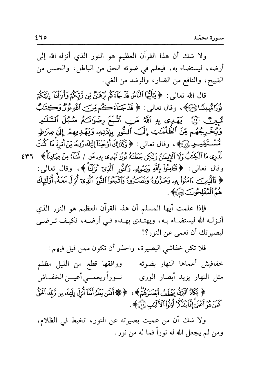 فإذا علمت أيها المسلم أن هذا القرآن العظيم هو النور الذي أنزله الله ليستضاء به، ويهتدى بهداه في أرضه، فكيف ترضى لبصيرتك أن تعمى عن النور؟!
