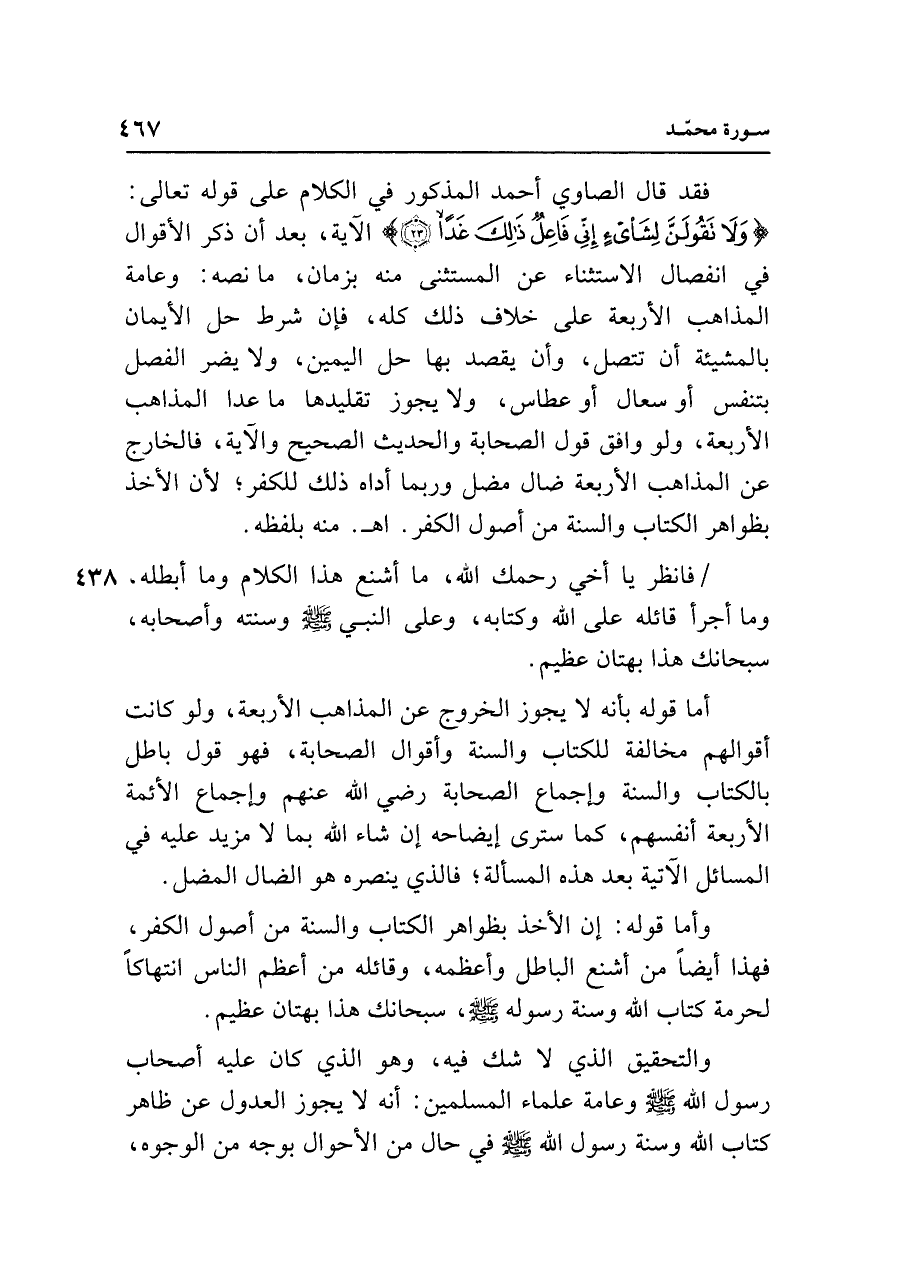 فقد قال الصاوي أحمد المذكور في الكلام على قوله تعالى: {وَلَا تَقُولَنَّ لِشَيءٍ إِنِّي فَاعِلٌ ذَلِكَ غَدًا (٢٣)} الآية، بعد أن ذكر الأقوال في انفصال الاستثناء عن المستثنى منه بزمان، ما نصه: وعامة المذاهب الأربعة على خلاف ذلك كله، فإن شرط حل الإيمان بالمشيئة أن تتصل، وأن يقصد بها حل اليمين، ولا يضر الفصل بتنفس أو سعال أو عطاس، ولا يجوز تقليدها ما عدا المذاهب الأربعة، ولو وافق قول الصحابة والحديث الصحيح والآية، فالخارج عن المذاهب الأربعة ضال مضل وربما أداه ذلك للكفر؛ لأن الأخذ بظواهر الكتاب والسنة من أصول الكفر. اهـ. منه بلفظه.