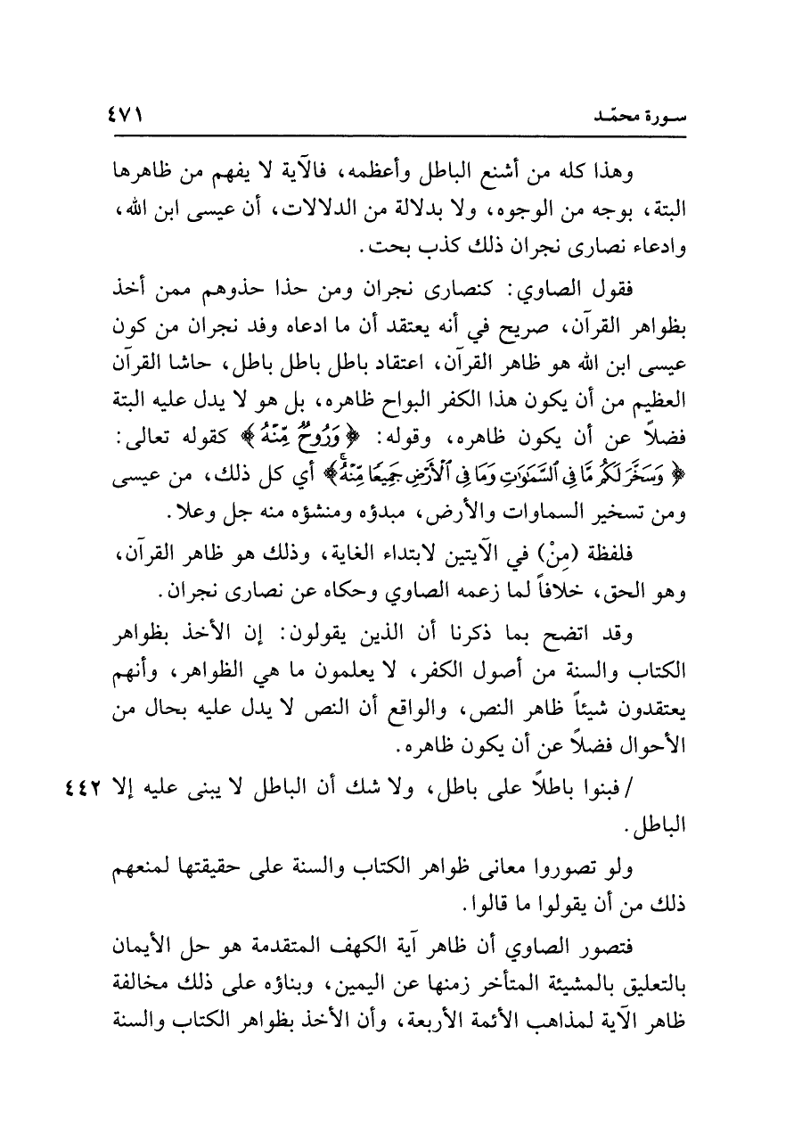فقول الصاوي: كنصارى نجران ومن هذا حذوهم ممن أخذ بظواهر القرآن، صريح في أنه يعتقد أن ما ادعاه وفد نجران من كون عيسى ابن الله هو ظاهر القرآن، اعتقاد باطل باطل باطل، حاشا القرآن العظيم من أن يكون هذا الكفر البواح ظاهره، بل هو لا يدل عليه البتة فضلًا عن أن يكون ظاهره، وقوله: {وَرُوحٌ مِنْهُ} كقوله تعالى: {وَسَخَّرَ لَكُمْ مَا فِي السَّمَاوَاتِ وَمَا فِي الْأَرْضِ جَمِيعًا مِنْهُ} أي كل ذلك، من عيسى ومن تسخير السماوات والأرض، مبدؤه ومنشؤه منه جل وعلا.