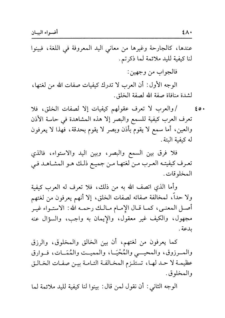 الوجه الأول: أن العرب لا تدرك كيفيات صفات الله من لغتها، لشدة منافاة صفة الله لصفة الخلق.