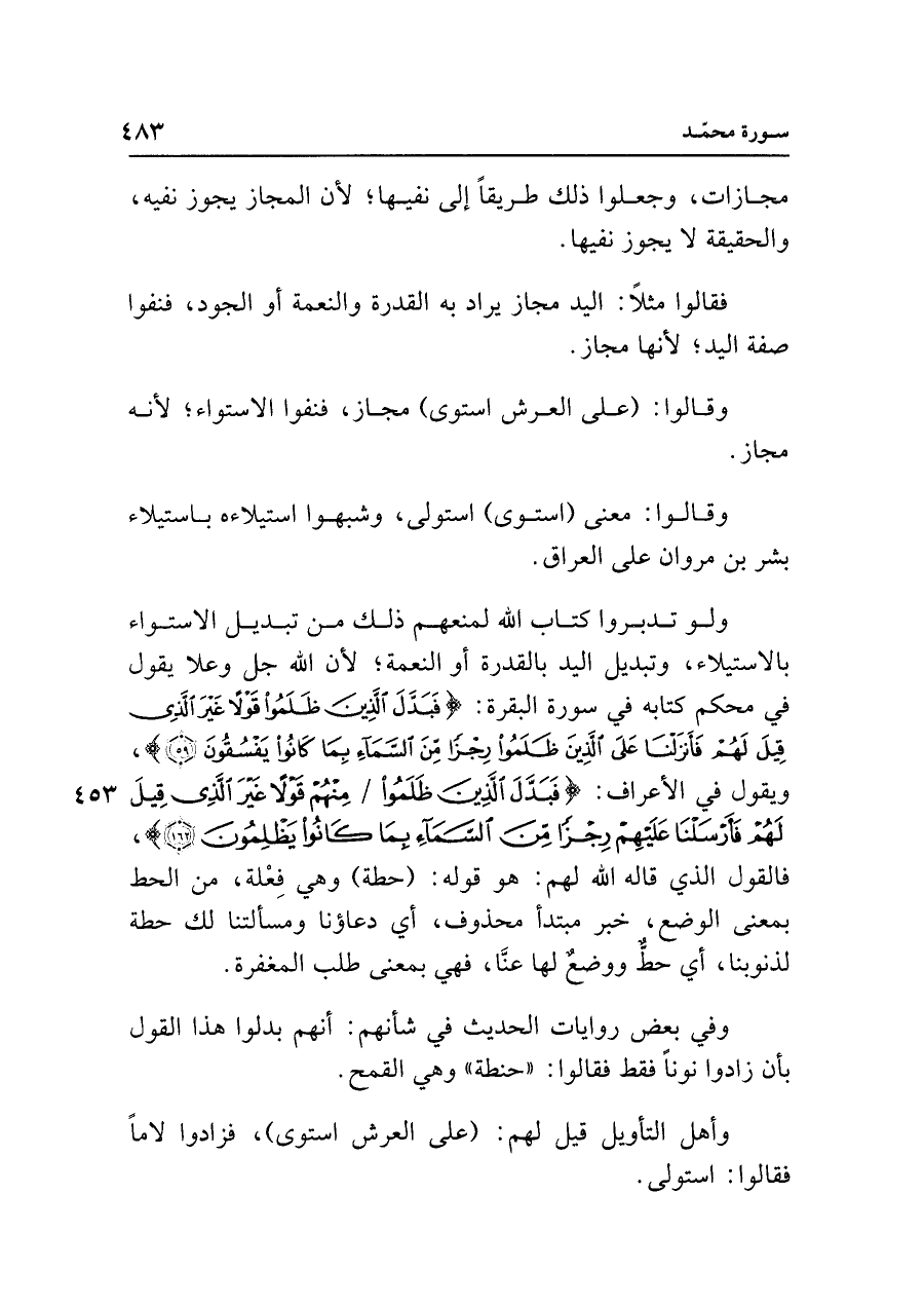 ولو تدبروا كتاب الله لمنعهم ذلك من تبديل الاستواء بالاستيلاء، وتبديل اليد بالقدرة أو النعمة؛ لأن الله جل وعلا يقول في محكم كتابه في سورة البقرة: {فَبَدَّلَ الَّذِينَ ظَلَمُوا قَوْلًا غَيرَ الَّذِي قِيلَ لَهُمْ فَأَنْزَلْنَا عَلَى الَّذِينَ ظَلَمُوا رِجْزًا مِنَ السَّمَاءِ بِمَا كَانُوا يَفْسُقُونَ (٥٩)}، ويقول في الأعراف: {فَبَدَّلَ الَّذِينَ ظَلَمُوا مِنْهُمْ قَوْلًا غَيرَ الَّذِي قِيلَ لَهُمْ فَأَرْسَلْنَا عَلَيهِمْ رِجْزًا مِنَ السَّمَاءِ بِمَا كَانُوا يَظْلِمُونَ (١٦٢)}، فالقول الذي قاله الله لهم: هو قوله: (حطة) وهي فِعْلة، من الحط بمعنى الوضع، خبر مبتدأ محذوف، أي دعاؤنا ومسألتنا لك حطة لذنوبنا، أي حطٌّ ووضعٌ لها عنَّا، فهي بمعنى طلب المغفرة.