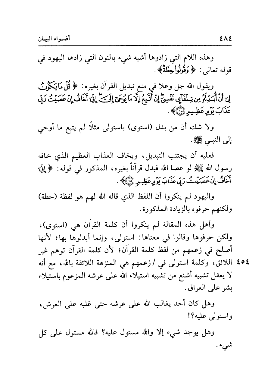 وأهل هذه المقالة لم ينكروا أن كلمة القرآن هي (استوى)، ولكن حرفوها وقالوا في معناها: استولى، وإنما أبدلوها بها؛ لأنها أصلح في زعمهم من لفظ كلمة القرآن؛ لأن كلمة القرآن توهم غير اللائق، وكلمة استولى في زعمهم هي المنزهة اللائقة بالله، مع أنه لا يعقل تشبيه أشنع من تشبيه استيلاء الله على عرشه المزعوم باستيلاء بشر على العراق.