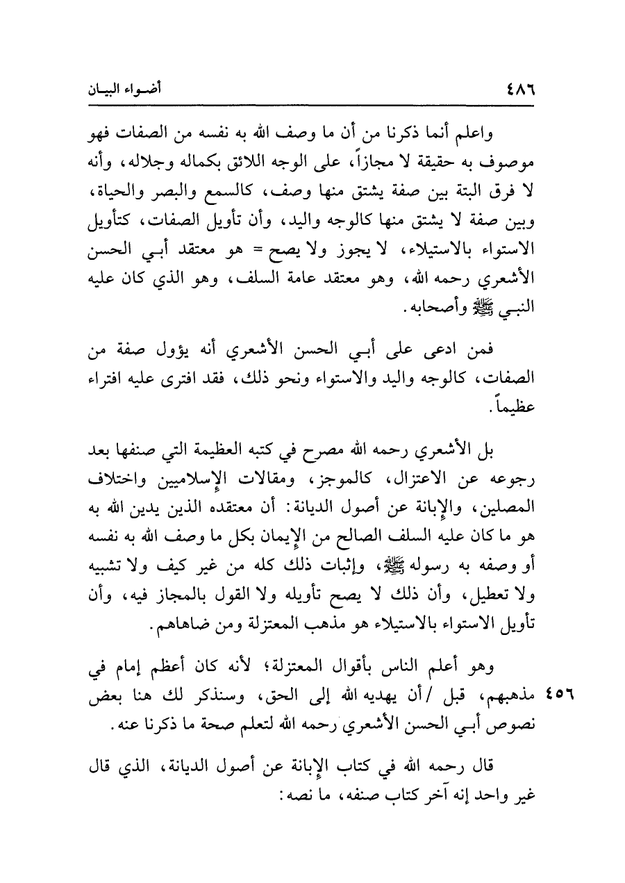 واعلم أنما ذكرنا من أن ما وصف الله به نفسه من الصفات فهو موصوف به حقيقة لا مجازًا، على الوجه اللائق بكماله وجلاله، وأنه لا فرق البتة بين صفة يشتق منها وصف، كالسمع والبصر والحياة، وبين صفة لا يشتق منها كالوجه واليد، وأن تأويل الصفات، كتأويل الاستواء بالاستيلاء، لا يجوز ولا يصح = هو معتقد أبي الحسن الأشعري رحمه الله، وهو معتقد عامة السلف، وهو الذي كان عليه النبي - صلى الله عليه وسلم - وأصحابه.