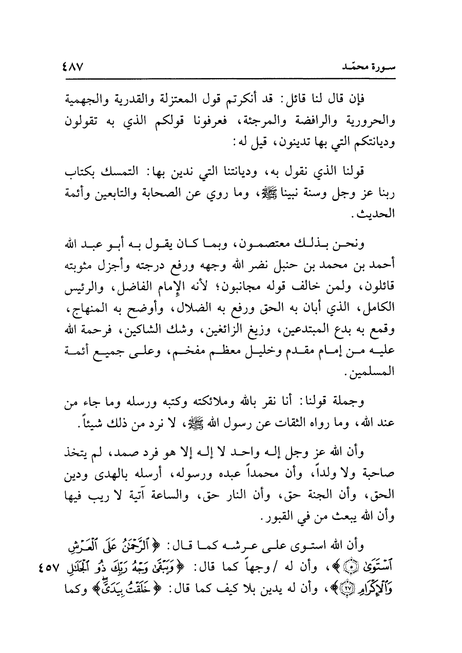 ونحن بذلك معتصمون، وبما كان يقول به أبو عبد الله أحمد بن محمد بن حنبل نضر الله وجهه ورفع درجته وأجزل مثوبته قائلون، ولمن خالف قوله مجانبون؛ لأنه الإِمام الفاضل، والرئيس الكامل، الذي أبان به الحق ورفع به الضلال، وأوضح به المنهاج، وقمع به بدع المبتدعين، وزيغ الزائغين، وشك الشاكين، فرحمة الله عليه من إمام مقدم وخليل معظم مفخم، وعلى جميع أئمة المسلمين.