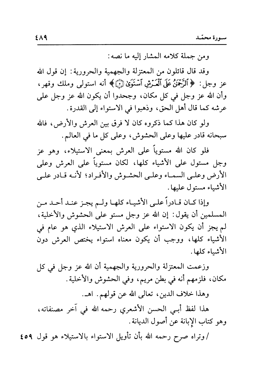 وإذا كان قادرًا على الأشياء كلها ولم يجز عند أحد من المسلمين أن يقول: إن الله عزَّ وجلَّ مستو على الحشوش والأخلية، لم يجز أن يكون الاستواء على العرش الاستيلاء الذي هو عام في الأشياء كلها، ووجب أن يكون معناه استواء يختص العرش دون الأشياء كلها.