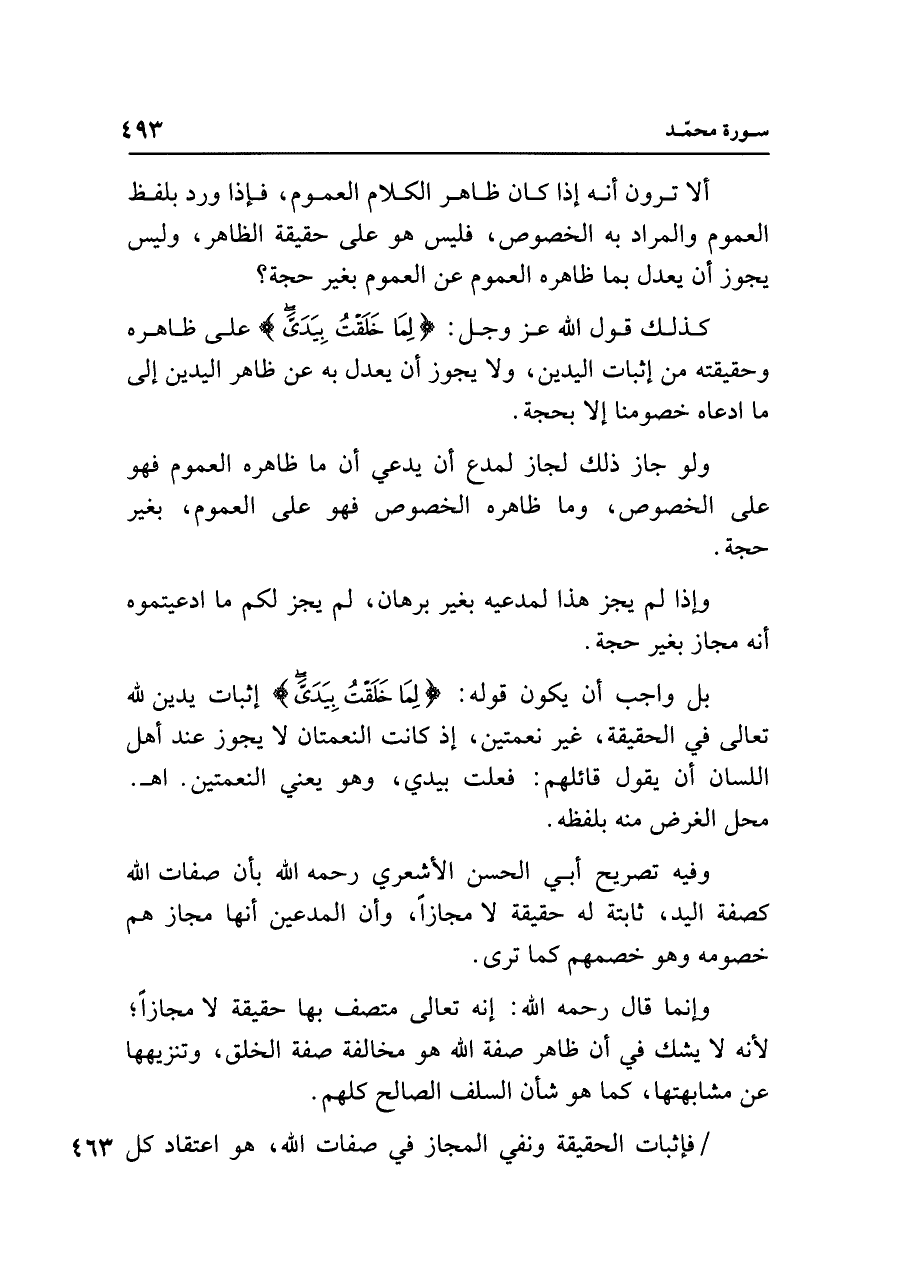كذلك قول الله عزَّ وجلَّ: {لِمَا خَلَقْتُ بِيَدَيَّ} على ظاهره وحقيقته من إثبات اليدين، ولا يجوز أن يعدل به عن ظاهر اليدين إلى ما ادعاه خصومنا إلا بحجة.