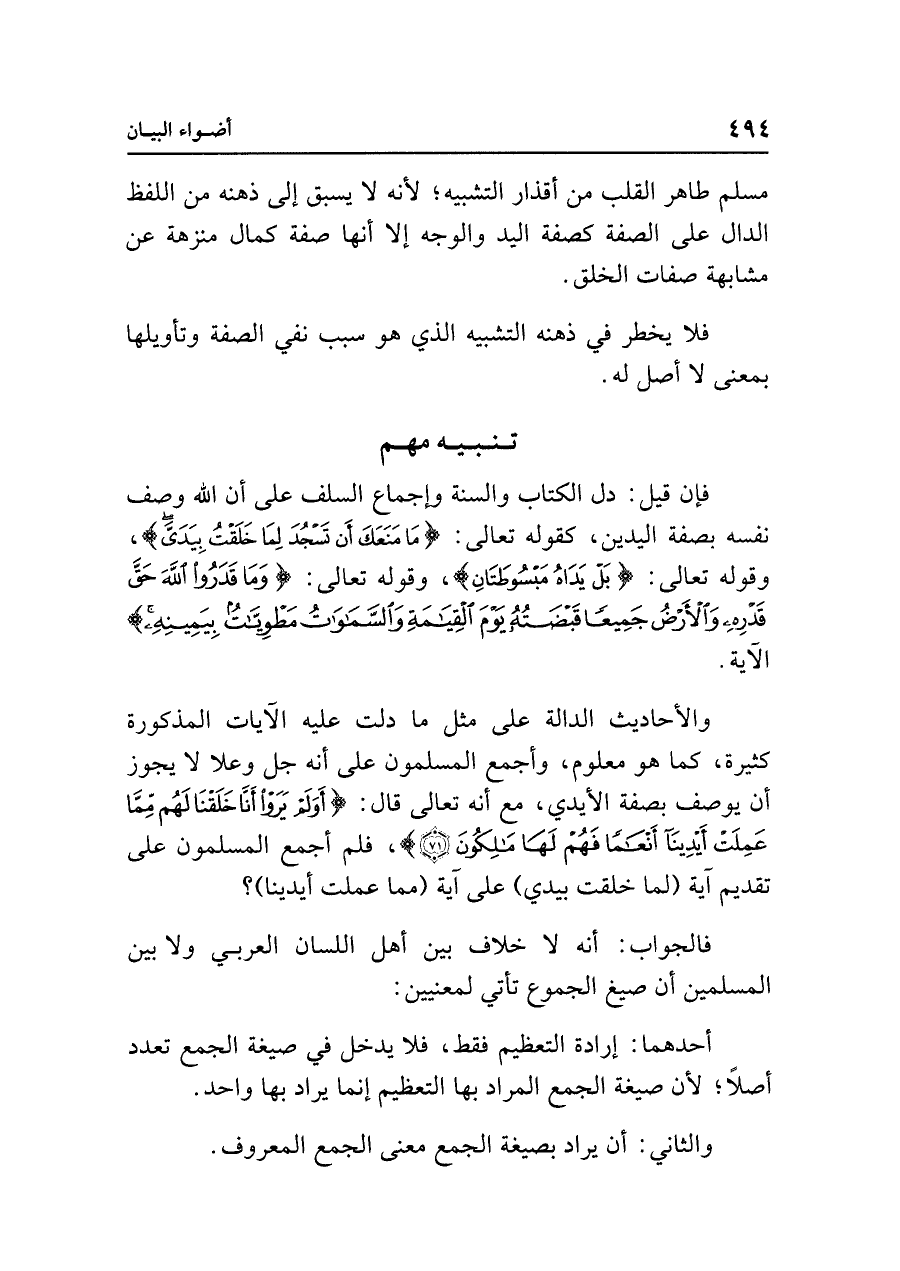 والأحاديث الدالة على مثل ما دلت عليه الآيات المذكورة كثيرة، كما هو معلوم، وأجمع المسلمون على أنه جل وعلا لا يجوز أن يوصف بصفة الأيدي، مع أنه تعالى قال: {أَوَلَمْ يَرَوْا أَنَّا خَلَقْنَا لَهُمْ مِمَّا عَمِلَتْ أَيدِينَا أَنْعَامًا فَهُمْ لَهَا مَالِكُونَ (٧١)}، فلم أجمع المسلمون على تقديم آية {لِمَا خَلَقْتُ بِيَدَيَّ} على آية {مِمَّا عَمِلَتْ أَيدِينَا}؟