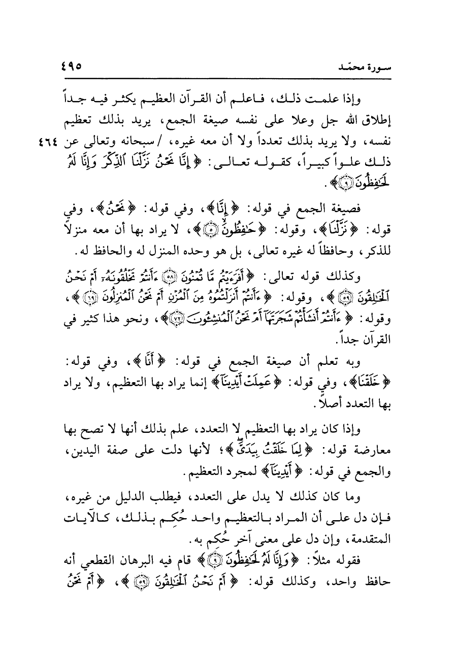 فقوله مثلًا: {وَإِنَّا لَهُ لَحَافِظُونَ (٩)} قام فيه البرهان القطعي أنه حافظ واحد، وكذلك قوله: {أَمْ نَحْنُ الْخَالِقُونَ (٥٩)}، {أَمْ نَحْنُ