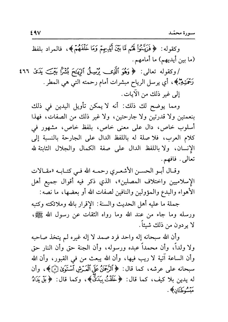 وقال أبو الحسن الأشعري رحمه الله في كتابه "مقالات الإِسلاميين واختلاف المصلين"، الذي ذكر فيه أقوال جميع أهل الأهواء والبدع والمؤولين والنافين لصفات الله أو بعضها، ما نصه: