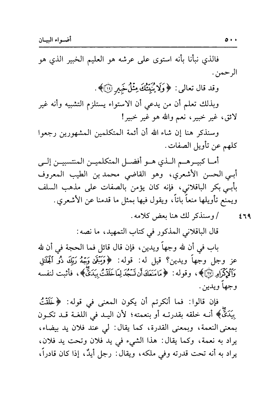 أما كبيرهم الذي هو أفضل المتكلمين المنتسبين إلى أبي الحسن الأشعري، وهو القاضي محمد بن الطيب المعروف بأبي بكر الباقلاني، فإنه كان يؤمن بالصفات على مذهب السلف ويمنع تأويلها منعًا باتًا، ويقول فيها بمثل ما قدمنا عن الأشعري.