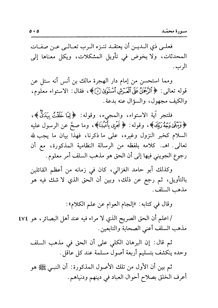 فلتجر آية الاستواء، والمجيء، وقوله: {لِمَا خَلَقْتُ بِيَدَيَّ}، {وَيَبْقَى وَجْهُ رَبِّكَ}، وقوله: {تَجْرِي بِأَعْيُنِنَا}، وما صحَّ عن الرسول عليه السلام كخبر النزول وغيره، على ما ذكرنا، فهذا بيان ما يجب لله تعالى. اهـ. كلامه بلفظه من الرسالة النظامية المذكورة، مع أن رجوع الجويني فيها إلى أن الحق هو مذهب السلف أمر معلوم.