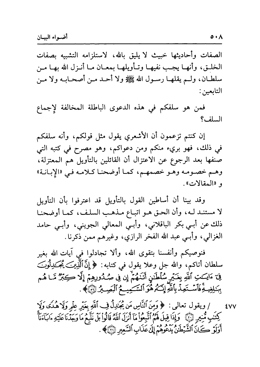 وقد بينا أن أساطين القول بالتأويل قد اعترفوا بأن التأويل لا مستند له، وأن الحق هو اتباع مذهب السلف، كما أوضحنا ذلك عن أبي بكر الباقلاني، وأبي المعالي الجويني، وأبي حامد الغزالي، وأبي عبد الله الفخر الرازي، وغيرهم ممن ذكرنا.