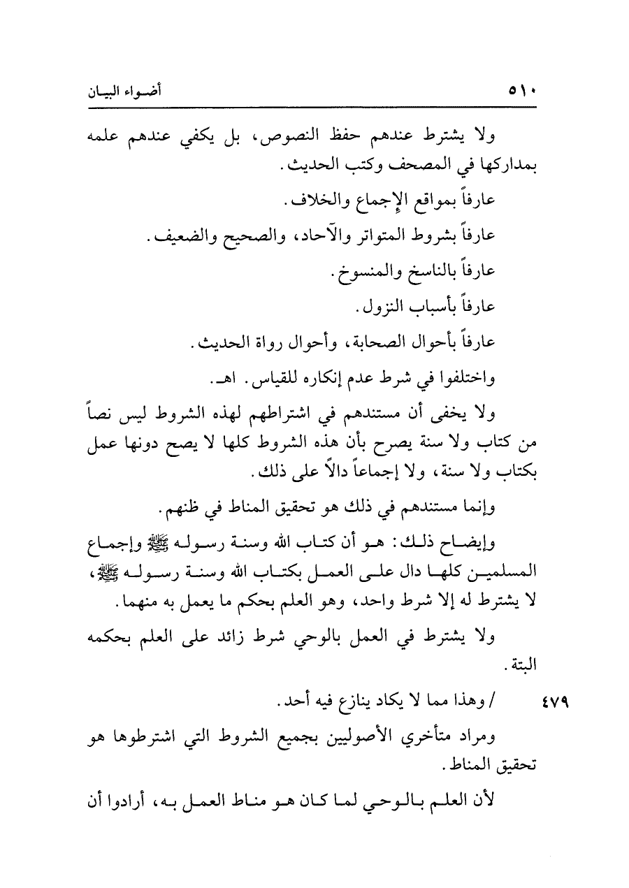 وإيضاح ذلك: هو أن كتاب الله وسنة رسوله - صلى الله عليه وسلم - وإجماع المسلمين كلها دال على العمل بكتاب الله وسنة رسوله - صلى الله عليه وسلم - ، لا يشترط له إلا شرط واحد، وهو العلم بحكم ما يعمل به منهما.
